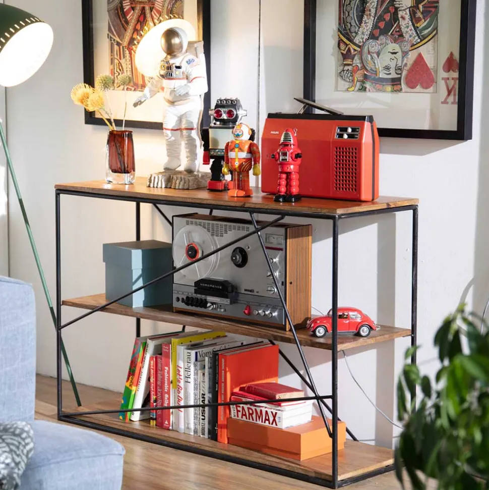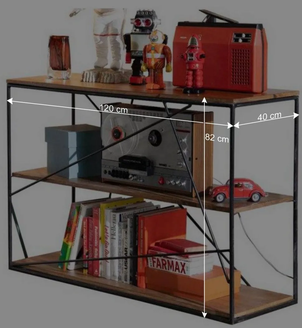 Mit einer Breite von 120 cm, einer Höhe von 82 cm und einer Tiefe von 40 cm bietet das Regal „Offia“ reichlich Platz für alles, was Sie zur Schau stellen oder verstauen möchten. Drei großzügige Böden laden dazu ein, Lieblingsbücher, Dekorationsobjekte oder sogar Pflanzen effektvoll zu präsentieren. Die stabilen Querstreben aus Metall sorgen nicht nur für die nötige Standfestigkeit, sondern sind auch ein optisches Highlight.