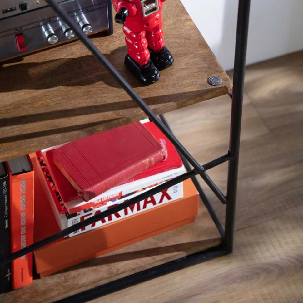 - Robuste Oberflächen, Holz naturbelassen und Metall in Schwarz lackiert