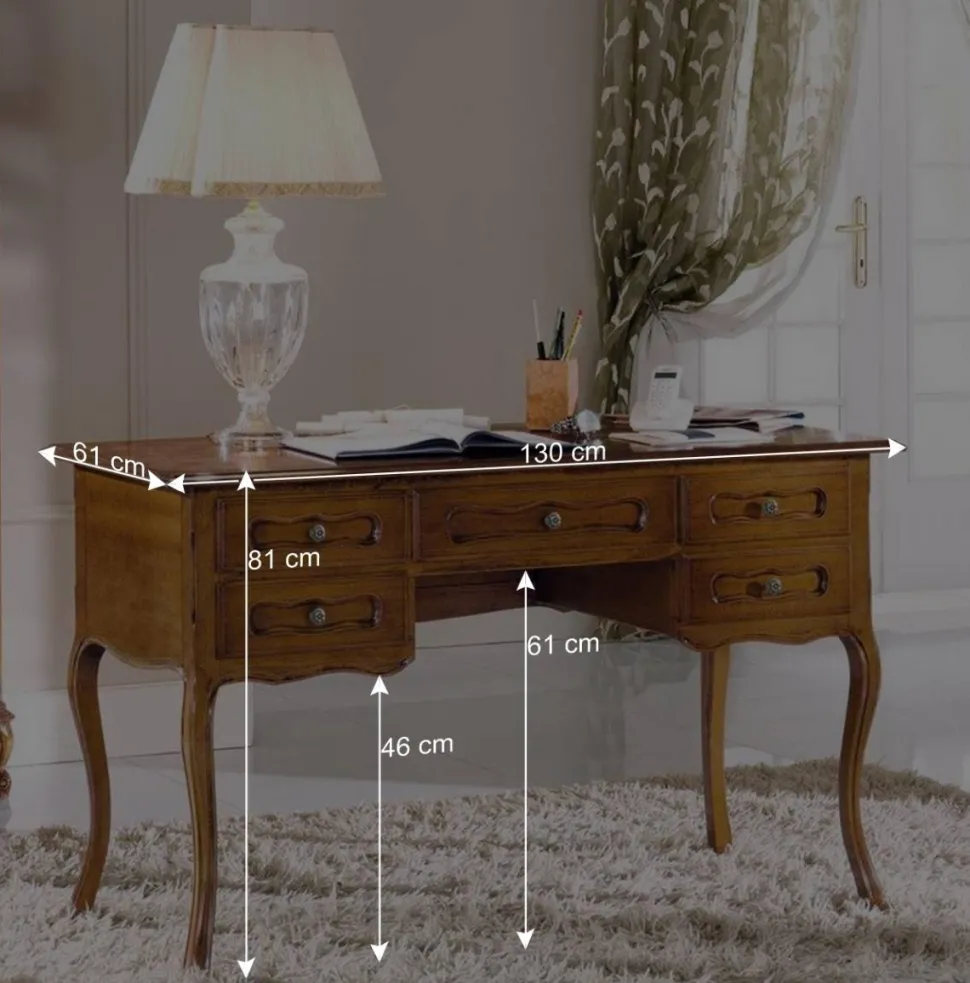 Die Oberflächen sind mit echtem Nussbaumholzfurnier veredelt und in einem warmen Nussbaumton lackiert. Die rechteckige Stellfläche des Tisches wird durch eine schwungvolle Linienführung betont, die dem Schreibtisch eine dynamische und doch harmonische Ausstrahlung verleiht. Die Tischplatte bietet mit ihrer großzügigen Überstand und der attraktiv formgefrästen Kante viel Platz für kreatives und effizientes Arbeiten. Die fünf Schubladen mit chic gefräster Front und hübschen Metall-Knopfgriffen runden das Gesamtbild ab.