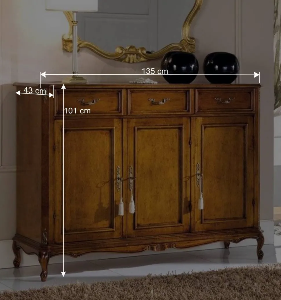 In puncto Funktion bietet Ihnen dieser italienische Schrank drei Schubladen auf Holzauszügen und drei Türen. Jedes der Türfächer ist durch einen verstellbaren Einlegeboden in zwei Bereiche unterteilt. Insgesamt hat der Schrank eine Breite von 135 cm, eine Höhe von 101 cm und eine Tiefe von 43 cm. Er wird Ihnen komplett aufgebaut geliefert, wobei es eventuell noch kleinere Teile gibt, die noch durch Sie zu montieren sind.
