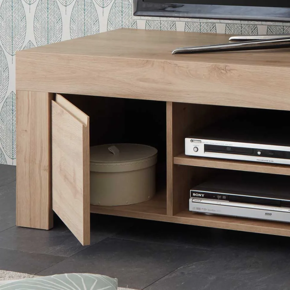 Freuen Sie sich auf das TV-Lowboard „Karika“, ein Möbelstück, das mit seinem modernen Design und seiner robusten Bauweise aus Spanplatte jeden Raum aufwertet. Die komplette Melaminbeschichtung in ansprechender Holzoptik Eiche sorgt nicht nur für eine natürliche und warme Ausstrahlung, sondern bietet auch den Vorteil einer pflegeleichten Oberfläche. Kratzer, Hitze und Feuchtigkeit können diesem Schmuckstück nichts anhaben, sodass es Ihnen lange Zeit Freude bereiten wird.