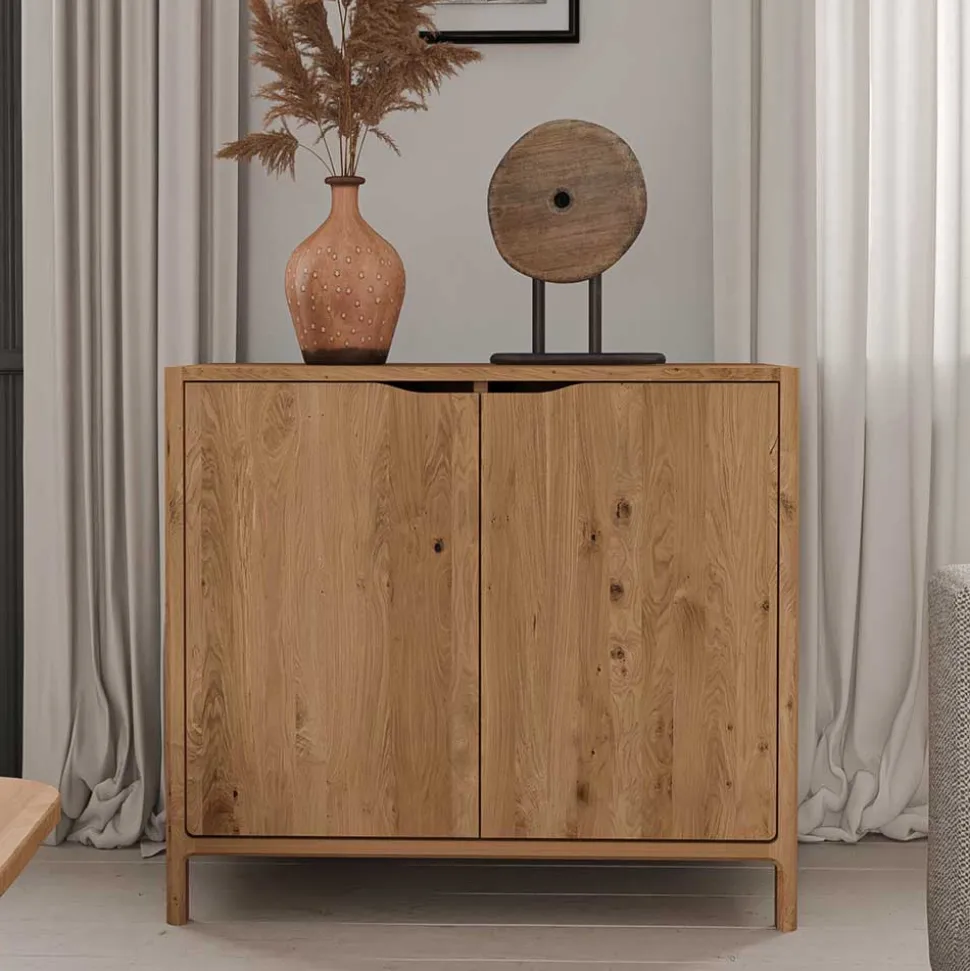 Die Kommode Laida besteht aus massiver Wildeiche mit durchgehender Lamelle – ein Qualitätsmerkmal, das für Stabilität und Langlebigkeit sorgt. Im Gegensatz zu verleimten Holzstücken zeigt die durchgehende Lamelle eine einheitliche Maserung, die dem Möbelstück eine besonders edle und natürliche Ausstrahlung verleiht. Wildeiche zeichnet sich durch ihre robuste Beschaffenheit aus und ist bekannt für ihre ausgeprägte Maserung, die jedes Möbelstück zu einem Unikat macht. Dank ihrer hohen Widerstandsfähigkeit ist dieses Holz besonders langlebig und hält selbst intensiver Nutzung mühelos stand.