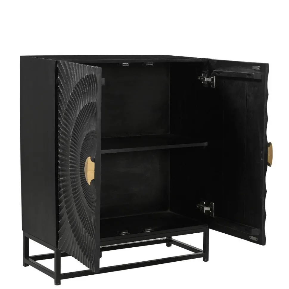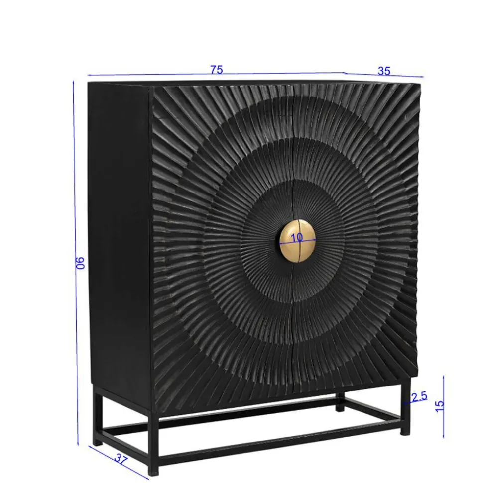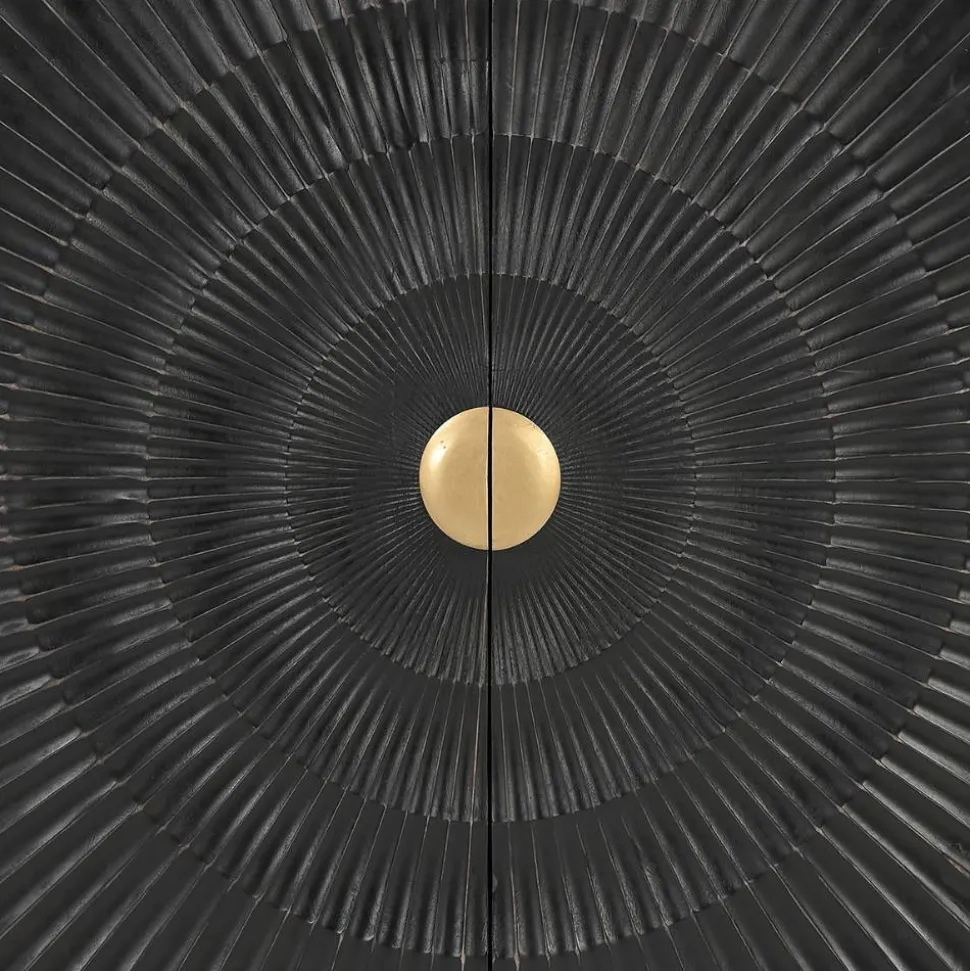 Hinter zwei dezent integrierten Drehtüren, ausgestattet mit hochwertigen Metallbeschlägen, verbirgt sich ein großzügiger Stauraum mit zwei Fächern – ideal, um Alltagsgegenstände, Bücher oder dekorative Elemente stilvoll zu verstauen. Die halbrunden Metallgriffe in edlem Goldton fügen sich perfekt ins Gesamtbild ein. Geschlossen ergeben sie einen eleganten Kreis mit etwa 10 Zentimetern Durchmesser – ein raffiniertes Detail, das die Design-Kommode auch haptisch zu einem Erlebnis macht.