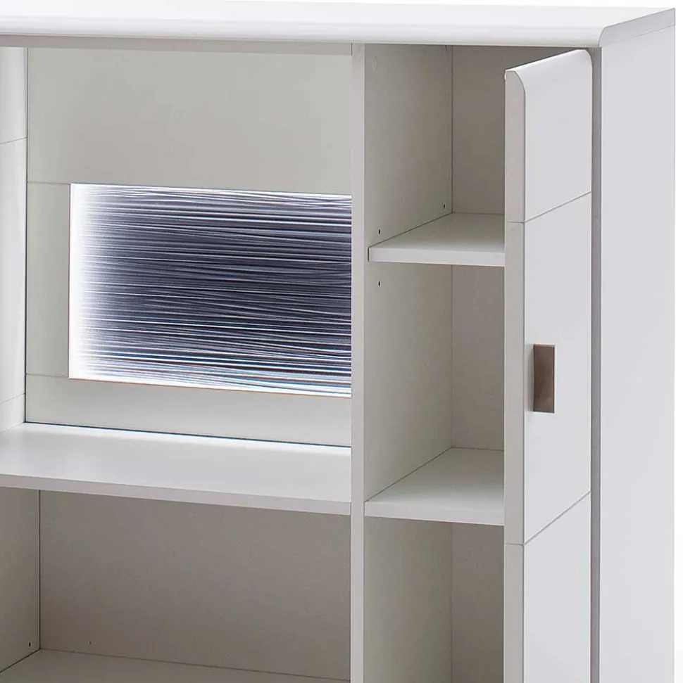 Das Innenleben des Highboards ist durchdacht konzipiert. Links finden Sie zwei Einlegeböden, während rechts sogar drei Einlegeböden zur Verfügung stehen. Damit haben Sie genügend Platz, um Ihre persönlichen Gegenstände und Dekorationen ansprechend zu präsentieren. Die Türen sind mit dezenten Metall-Griffleisten in Silberfarben ausgestattet, die nicht nur funktional sind, sondern auch das Gesamtbild des Highboards abrunden.