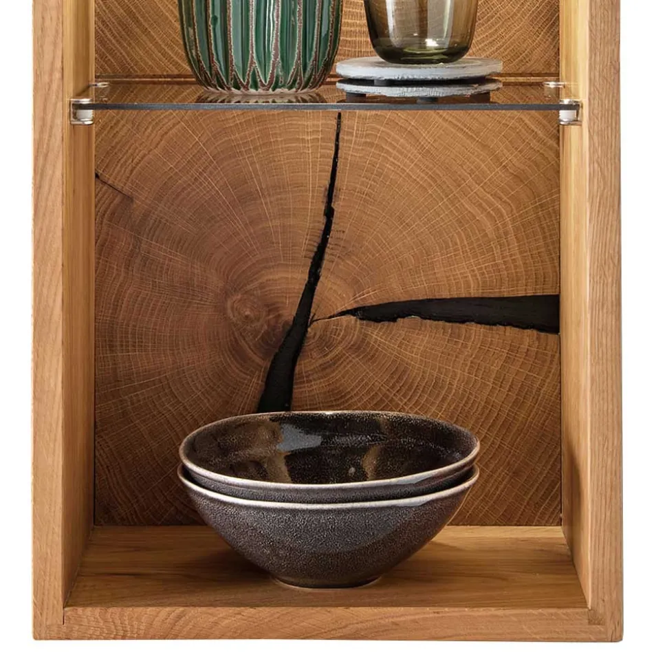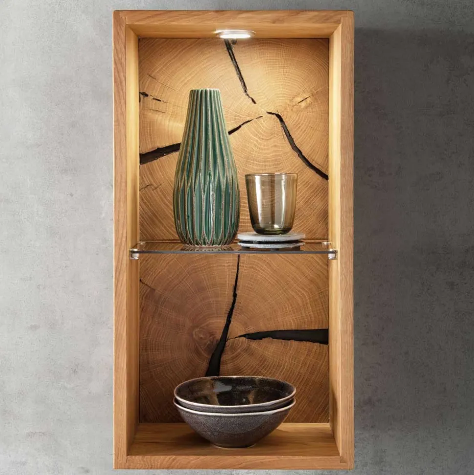 Die Rückwand aus Hirnholz ist ein markantes Detail, das das „Acapella“ Regal von anderen Möbelstücken abhebt. Hirnholz, geschnitten quer zur Faser, zeigt die Jahresringe und natürliche Struktur des Baumes, was dieses Wandregal zu einem wahren Blickfang macht.