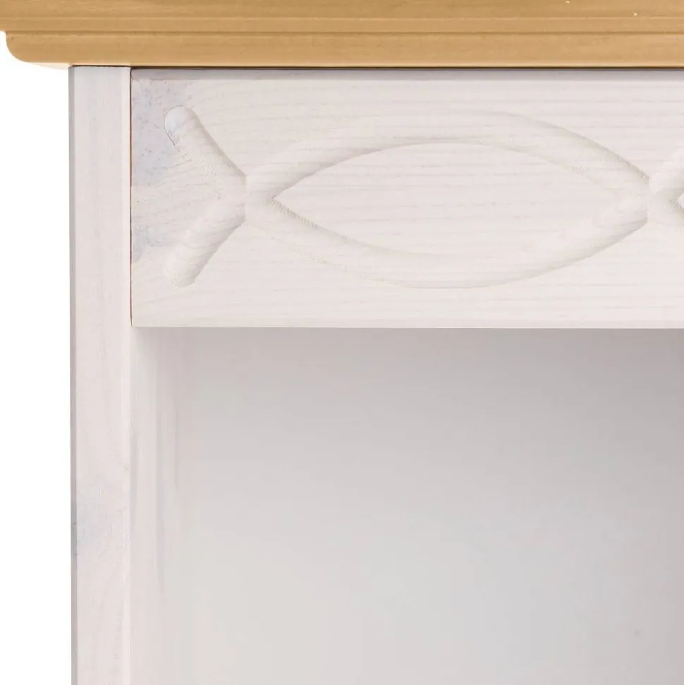 Die sorgfältig weiß lackierte Oberfläche lässt die einzigartige Holzmaserung dezent durchscheinen – ein liebevolles Detail, das dem Regal Leichtigkeit und Tiefe verleiht. So entsteht ein harmonisches Zusammenspiel aus klassischer Eleganz und natürlicher Ursprünglichkeit. Diese Verarbeitung schützt nicht nur das Holz, sondern bewahrt seinen authentischen Charakter.