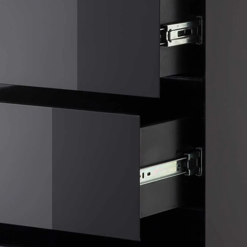 Die MDF-Oberfläche der Kommode erstrahlt in einem tiefen Schwarz Hochglanz, das für einen edlen, reflektierenden Glanz sorgt. Der Oberboden und der Sockel, beide aus massiver Asteiche, sind geölt, was den natürlichen Charakter des Holzes betont und gleichzeitig für zusätzlichen Schutz sorgt. Besondere Aufmerksamkeit verdienen die Risse, Astlöcher und gefrästen Unebenheiten des Oberbodens, die das authentische Erscheinungsbild der Asteiche hervorheben.