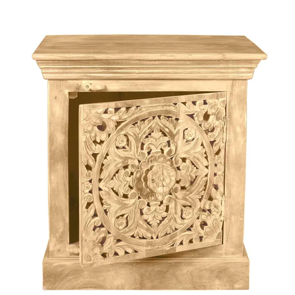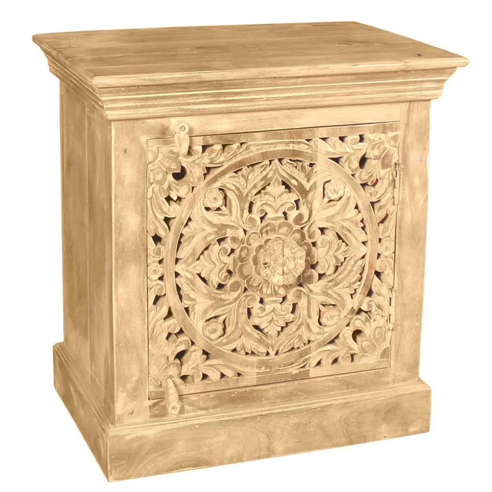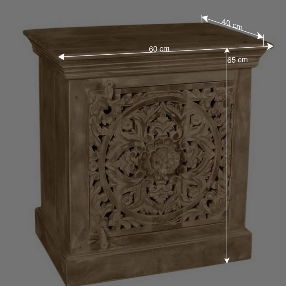 Der kleine Schrank „Runiasa“ ist ein einzigartiges Möbelstück, welches in aufwendiger Handwerkskunst und mit viel Liebe zum Detail gefertigt wird. Er wird aus massivem Mangobaumholz hergestellt und besitzt eine lackierte Oberfläche in Sandfarben, welche dem Schrank einen besonders charmanten Vintage Look verleiht.