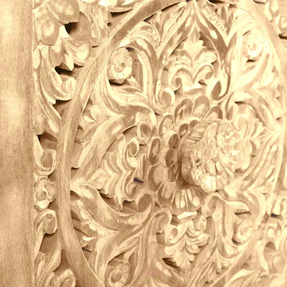 Das Highlight des Schranks sind zweifelsohne die aufwändigen Schnitzereien, die von Hand gestaltet werden und jeden Schrank zu einem Unikat machen. Florale Motive zieren die Türfront und unterstreichen den besonderen Look des Schranks. Ein kleiner Holzverschluss an der Tür sorgt dafür, dass alles sicher aufbewahrt wird.