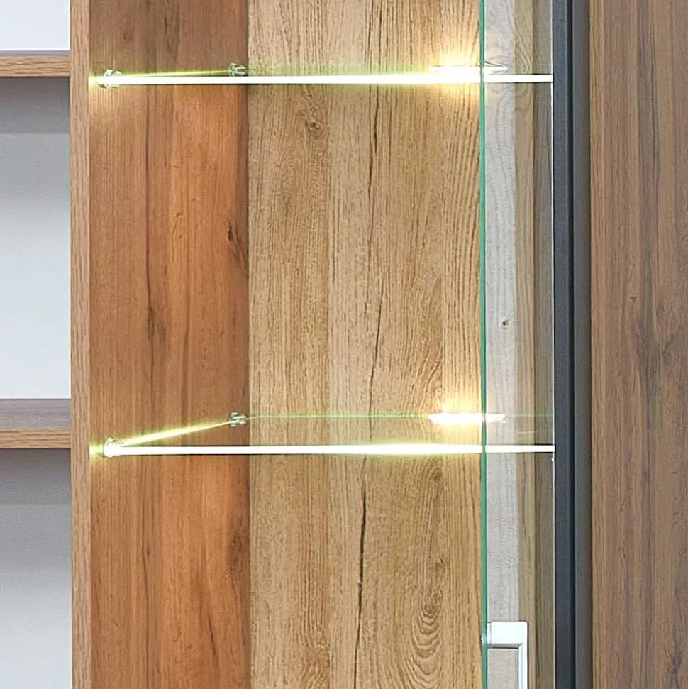 Die Innenraumgestaltung der Vitrine ist durchdacht und praktisch. Fünf Einlegeböden auf der linken Seite und eine Kombination aus drei Glasböden und zwei Einlegeböden auf der rechten Seite bieten Ihnen vielfältige Aufbewahrungsmöglichkeiten. Ein weiteres Highlight ist die integrierte LED-Beleuchtung an den Glasböden, die Ihre präsentierten Objekte perfekt in Szene setzt.