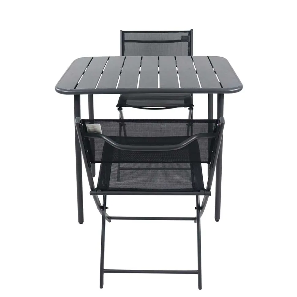 Modernes Design bedeutet hier eine klare Formensprache und zeitgemäße Materialien. Die schlichten Linien und die reduzierte Optik des Sets sorgen für eine stilvolle und einladende Atmosphäre im Freien. Der schwarze Metallrahmen der Stühle und des Tisches ist nicht nur stabil, sondern verleiht Ihrem Außenbereich ein elegantes und modernes Flair. Der Mix aus Metall und Textilgewebe wirkt leicht und dennoch robust – perfekt für eine moderne, funktionale Einrichtung.