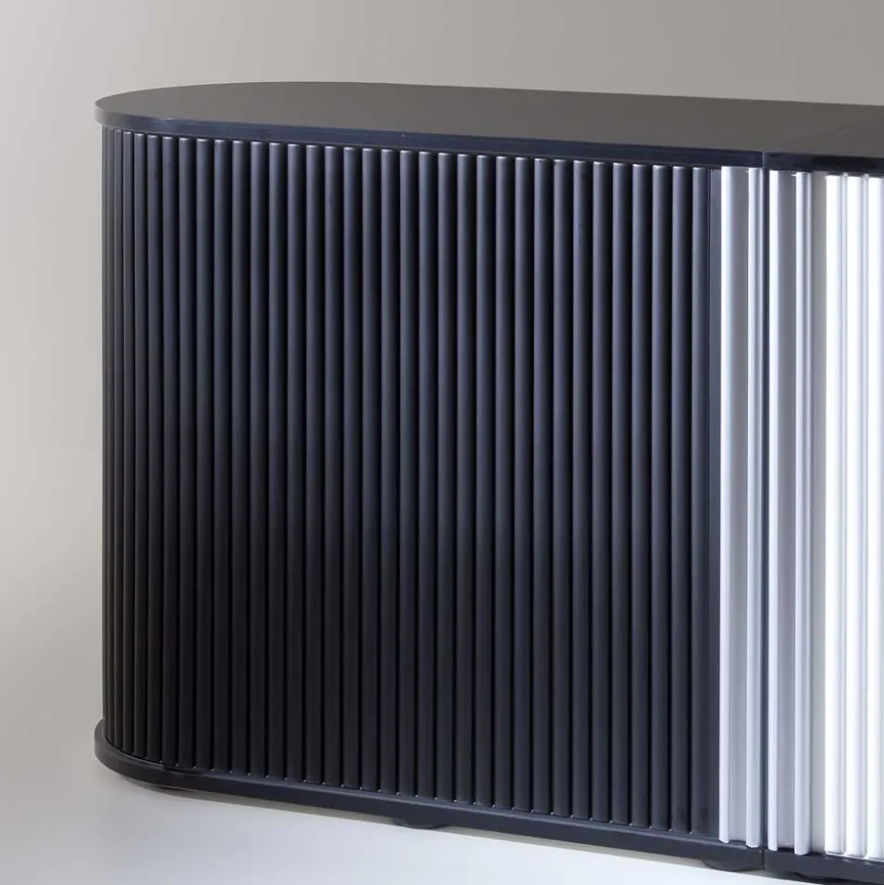 Mit einer Breite von 196 cm, einer Höhe von 82 cm und einer Tiefe von 45 cm bietet dieser Schrank jede Menge Stauraum – perfekt für alles, was geordnet und griffbereit verstaut werden soll. Zwei nebeneinander stehende Schränke bilden die Basis des Möbels und sorgen für ein besonders harmonisches Gesamtbild. Hinter den beiden Jalousie-Türen in elegantem Schwarz und Weiß, die sich ganz leicht per eloxierter Aluminium-Griffleiste auf- und zuziehen lassen, verbirgt sich jeweils ein großzügiger Fachboden mit Ordnerhöhe. Damit eignet sich „Siparia“ hervorragend zur Aufbewahrung von Akten, Haushaltsutensilien, Technik oder Alltagsgegenständen – je nachdem, wie Sie ihn einsetzen möchten.