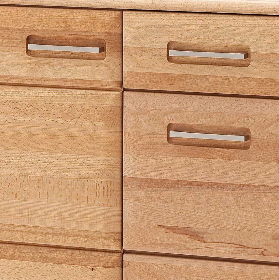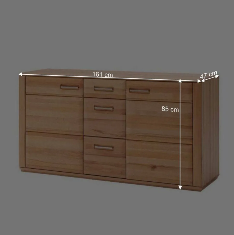 Die Front des Sideboards „Athias“ besteht aus massiver Kernbuche. Bekannt für ihre beeindruckende Härte und Dichte, bringt die Kernbuche ein robustes, langlebiges und zugleich ästhetisch ansprechendes Element in dieses Möbelstück. Der Korpus ist aus wertiger Spanplatte gefertigt und mit echtem Holzfurnier veredelt, was einen reizvollen Kontrast zur massiven Kernbuche bildet.