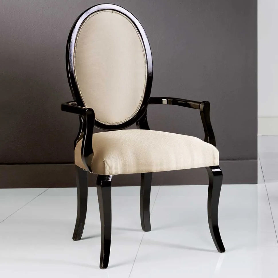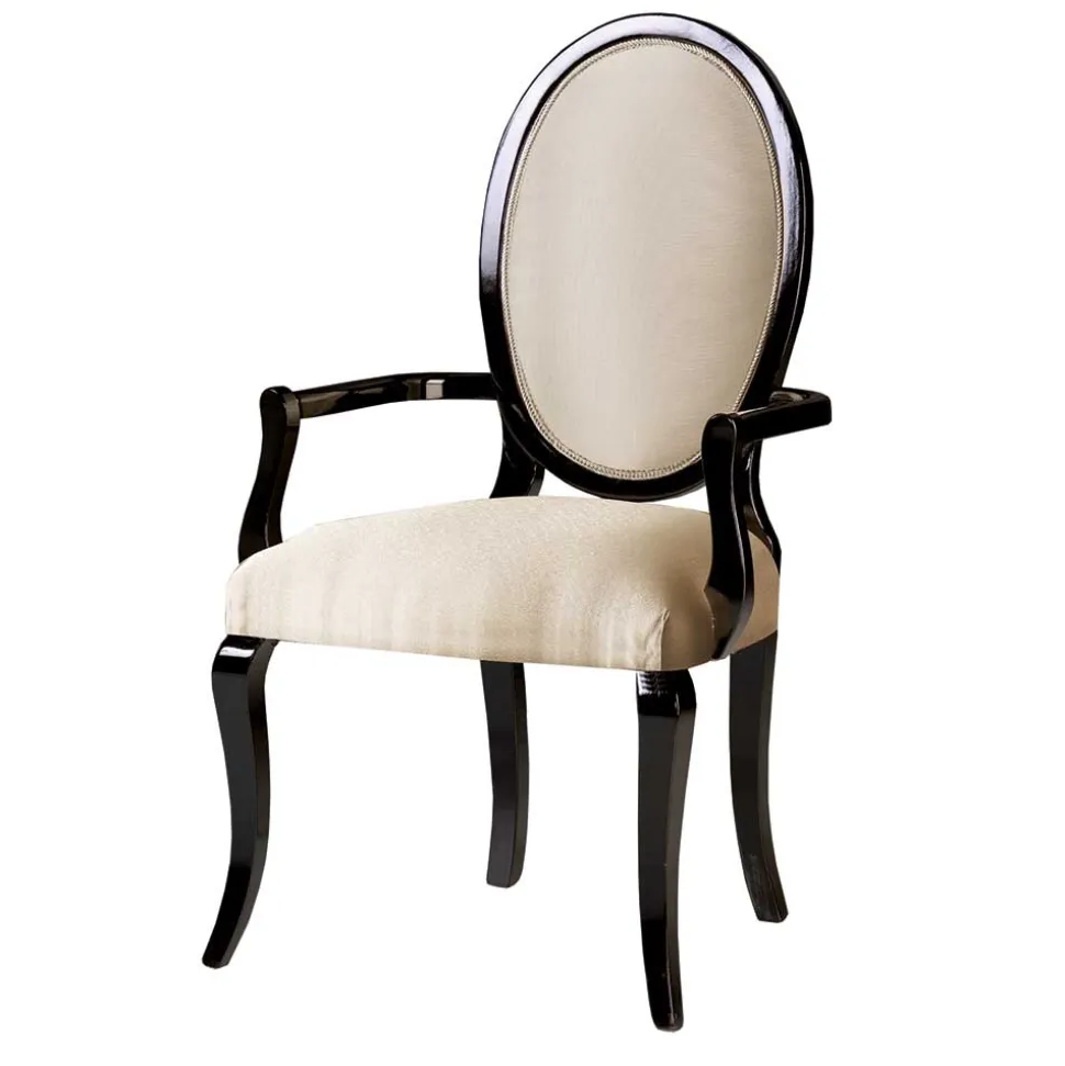 Die nach außen gewölbten Holz-Armlehnen mit einer Höhe von ca. 64 cm verleihen dem Stuhl einen dekorativen Charakter und bieten zusätzlichen Komfort. Die Sitzhöhe von ca. 51 cm ermöglicht bequemes Sitzen, und die großzügige Medaillon-Form der Rückenlehne schafft ein luxuriöses Ambiente.