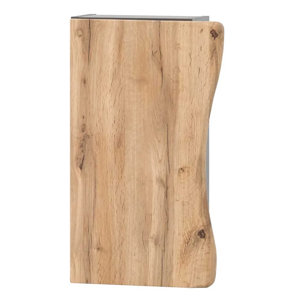 Der robuste Korpus besteht aus hochwertiger Spanplatte, die für ihre Stabilität, Formbeständigkeit und Umweltfreundlichkeit geschätzt wird. Die Front aus MDF punktet mit glatten, strapazierfähigen Oberflächen und erlaubt die filigrane Gestaltung der organischen Baumkante. MDF in Wildeiche-Optik, foliert mit fühlbarer Holzstruktur, sorgt für eine authentische Haptik, während tiefgezogene Kanten der Front einen besonders harmonischen Übergang bieten. Der dunkle, melaminbeschichtete Korpus überzeugt durch seine kratzfeste und pflegeleichte Oberfläche, das helle, weiße Innendekor sorgt für einen frischen Kontrast und eine freundliche Atmosphäre beim Öffnen.