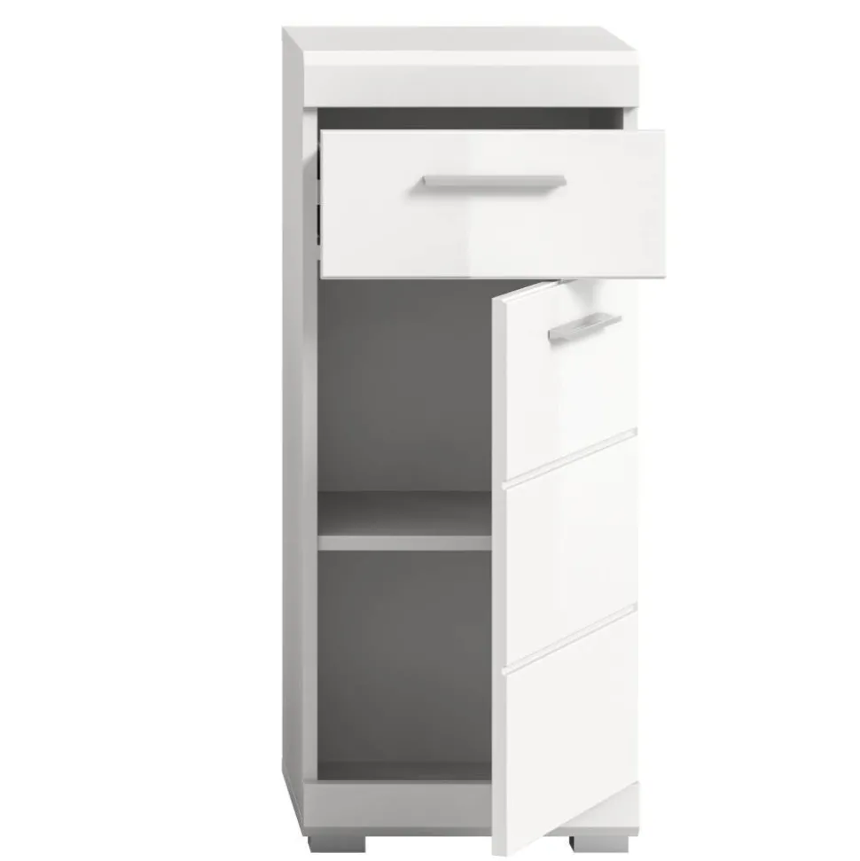 Der Schrank ist mit einer Schublade auf Metallvollauszug ausgestattet, die bis zu 2 kg belastbar ist, sowie einer Drehtür. Hinter der Tür befindet sich ein verstellbarer Einlegeboden, der bis zu 5 kg belastbar ist und flexiblen Stauraum für Handtücher, Pflegeprodukte oder andere Badutensilien bietet. Die beidseitig montierbare Tür und das silberfarbene Fußgestell mit 2 cm Bodenfreiheit erhöhen den Bedienkomfort.