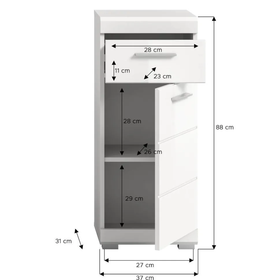 Mit den Maßen 37 cm Breite, 88 cm Höhe und 31 cm Tiefe ist der Bad-Unterschrank kompakt, bietet jedoch ausreichend Stauraum. Das Möbelstück wird zerlegt geliefert; eine leicht verständliche Aufbauanleitung und das notwendige Befestigungsmaterial sind im Lieferumfang enthalten.