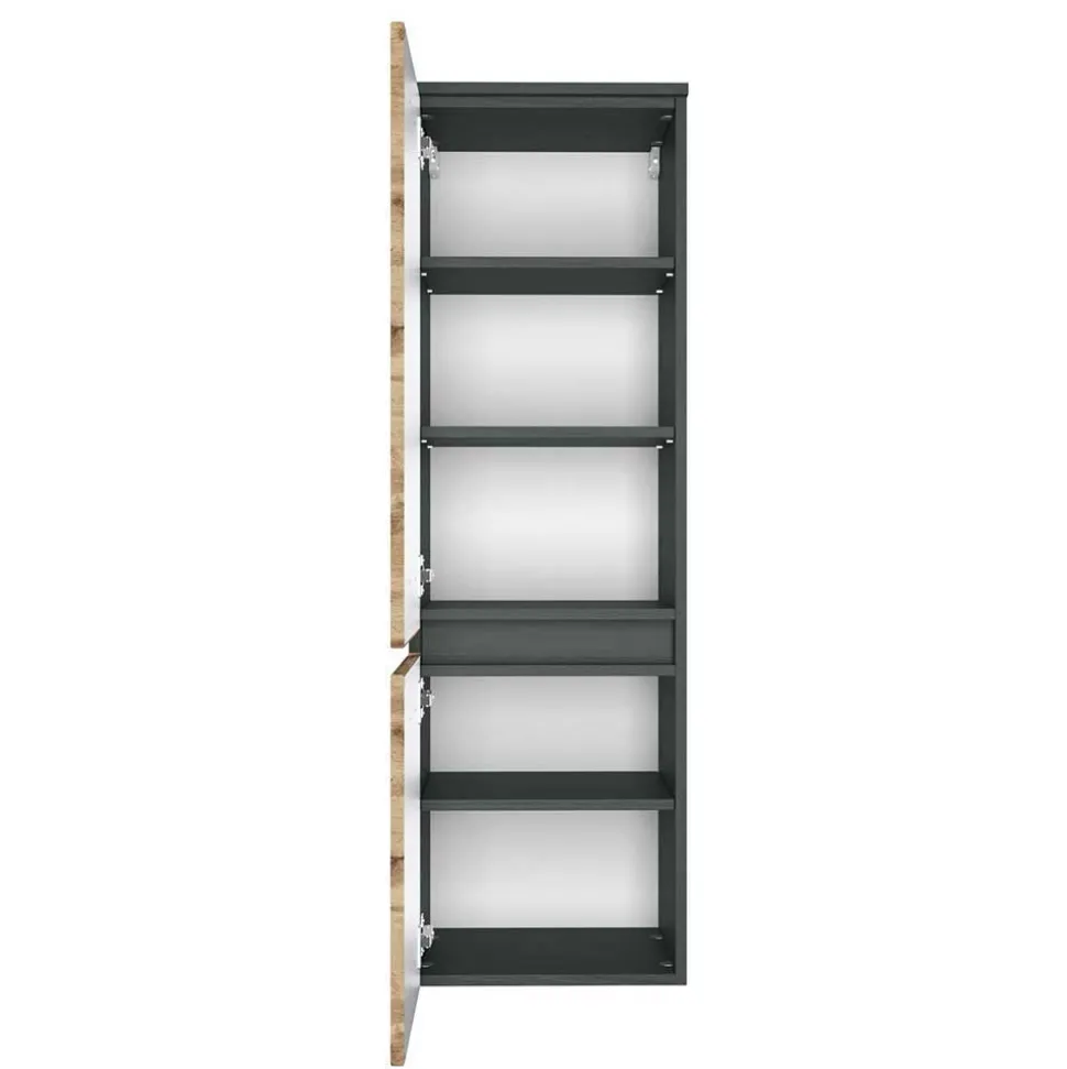 Der Korpus besteht aus robuster Spanplatte und ist mit einer pflegeleichten, melaminbeschichteten Oberfläche in Dunkelgrau versehen. Diese Beschichtung sorgt nicht nur für Widerstandsfähigkeit gegen Feuchtigkeit und Kratzer, sondern lässt sich auch mühelos reinigen – ideal für den täglichen Gebrauch im Badezimmer. Die Fronten aus MDF sind in Wildeiche-Holzoptik foliert und verleihen dem Möbelstück seine authentische, natürliche Wirkung. Ergänzt wird das Ensemble durch glänzendes Spiegelglas, das das Licht sanft reflektiert und den Raum optisch vergrößert.