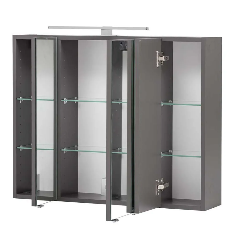 Der Spiegelschrank (80 x 64 x 20 cm, mit Aufbauleuchte 80 x 67,5 x 30 cm) überzeugt mit drei Türen, sechs verstellbaren Glasböden und einer praktischen Schalter-Steckdosenkombination in der Mitte. Dezente Metallgriffe an der Unterkante runden das Design harmonisch ab.