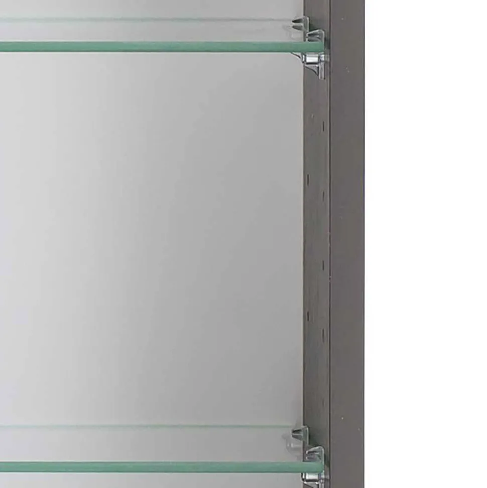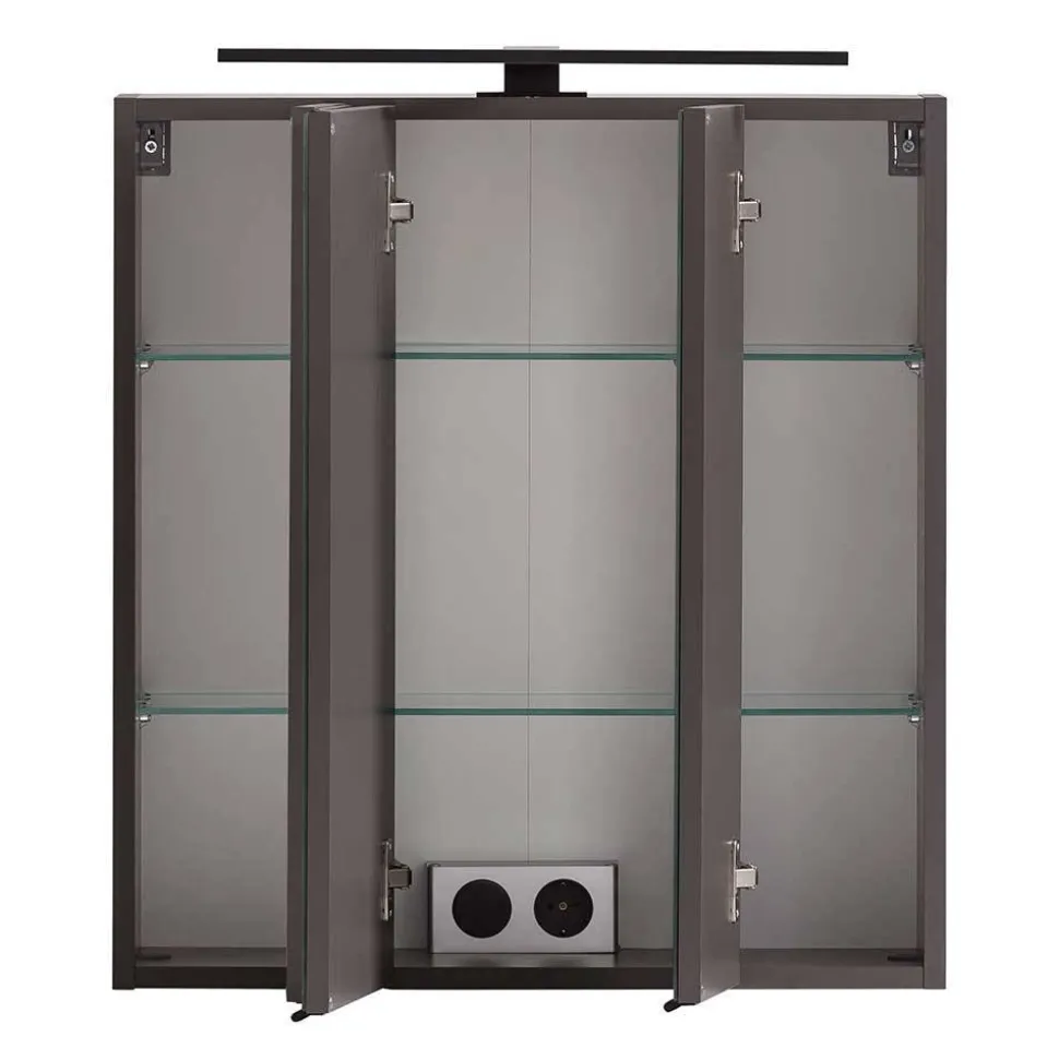 Schon beim Öffnen des Spiegelschranks spüren Sie die Liebe zum Detail: Drei Drehtüren mit schwarzen, dezenten Metallgriffen verbergen drei Fachelemente, in denen jeweils zwei stabile Glasböden für Ordnung sorgen. Mit einer Materialstärke von 5 mm und einer Tragkraft von bis zu 3 kg bieten diese Böden ausreichend Platz für Ihre wichtigsten Pflegeprodukte. Eine integrierte LED-Beleuchtung mit 700 Lumen und einer warmweißen Farbtemperatur von 4000 K schafft ein natürliches, angenehmes Licht, während die sparsame Leistungsaufnahme von 9,6 W und ein Energieverbrauch von nur 7 kWh/1000 h für Energieeffizienz stehen. Eine praktische Steckdose und ein Schalter im Inneren erhöhen den Komfort zusätzlich.
