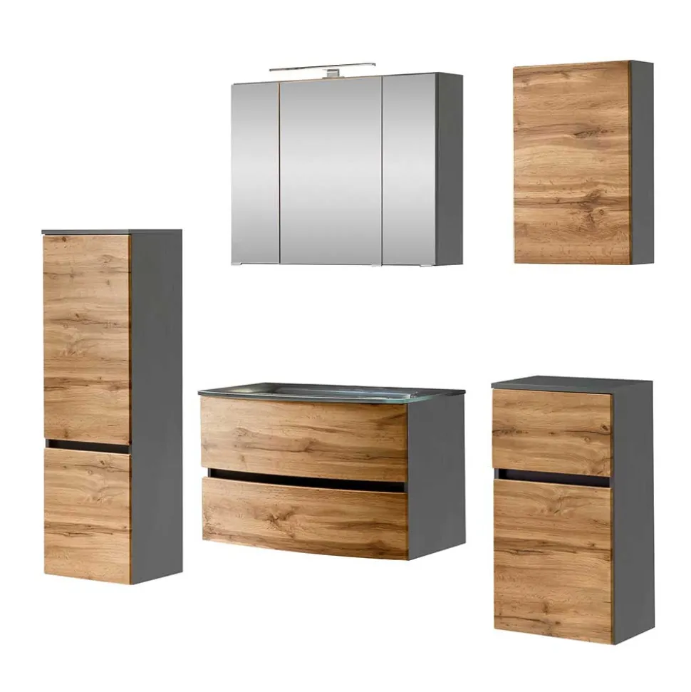 Der Korpus besteht aus robuster Spanplatte und ist melaminbeschichtet – diese hochwertige Beschichtung schützt die Oberfläche zuverlässig vor Kratzern, Feuchtigkeit und täglicher Abnutzung. Die MDF-Fronten werden aufwendig in Wildeiche foliert, was ihnen eine täuschend echte Holzstruktur verleiht und gleichzeitig pflegeleicht macht. Ergänzt wird das Ensemble durch makelloses Spiegelglas, das den Raum optisch vergrößert und für strahlende Reflexionen sorgt.
