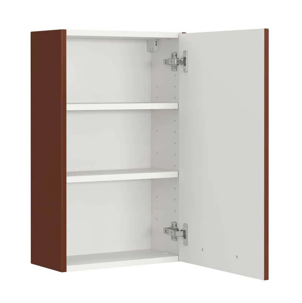 Hergestellt aus MDF und Spiegelglas, begeistert das Set mit langlebigen, pflegeleichten Oberflächen. Die Außenseiten der Möbel sind in einem satten Dunkelrot foliert, während das Innenleben mit einer kontrastierenden weißen Beschichtung aufwartet. Die tiefgezogenen Kanten sorgen für eine nahtlose, edle Optik. Metallene Griffleisten in Schwarz setzen moderne Akzente und unterstreichen das elegante Gesamtbild.