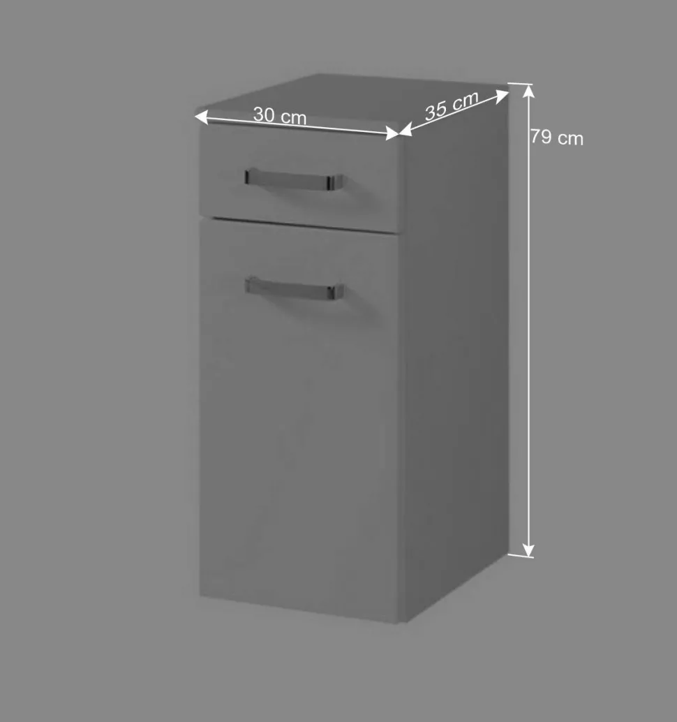 Die beiden Hängeschränke (jeweils BxHxT: 30x64x35 cm) verfügen über eine Tür mit gedämpften Scharnieren und zwei Einlegeböden – ideal für Handtücher, Kosmetik oder Pflegeartikel. Auch die beiden Unterschränke (jeweils BxHxT: 30x79x35 cm) bieten durch je eine Tür mit dahinterliegendem Einlegeboden und eine leichtgängige Schublade mit Metall-Vollauszug und Softclose jede Menge Raum für Ihre Badezimmer-Utensilien. Gedämpfte Scharniere sorgen für ein sanftes Schließen und verhindern unangenehme Geräusche.