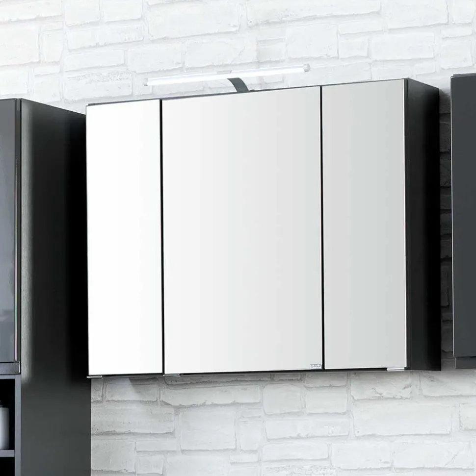 Ein Spiegelschrank in drei Breiten (60, 80 oder 100 cm, Höhe 64 cm, Tiefe 20 cm ohne Aufbauleuchte / mit Aufbauleuchte 67 cm hoch, 28 cm tief). Drei vollflächig verspiegelte Türen verbergen sechs Glasböden für Ihre Badutensilien. Integriert sind eine energiesparende LED-Aufbauleuchte, eine innenliegende Steckdose samt Konverter und Schalter sowie dezente Metallgriffe an der Unterkante.