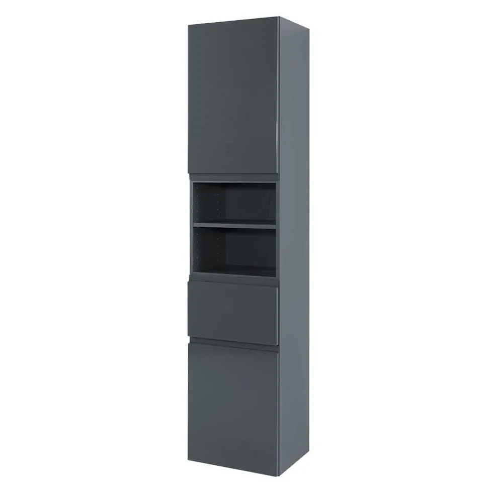 Ein hoher Seitenschrank (40x180x35 cm) mit zwei Türen, gedämpftem Schließmechanismus, praktischen Einlegeböden und einem offenen Fach mit zusätzlichem Regalboden sowie einem hochwertigen Schubkasten mit Metallauszug und Metallreling.