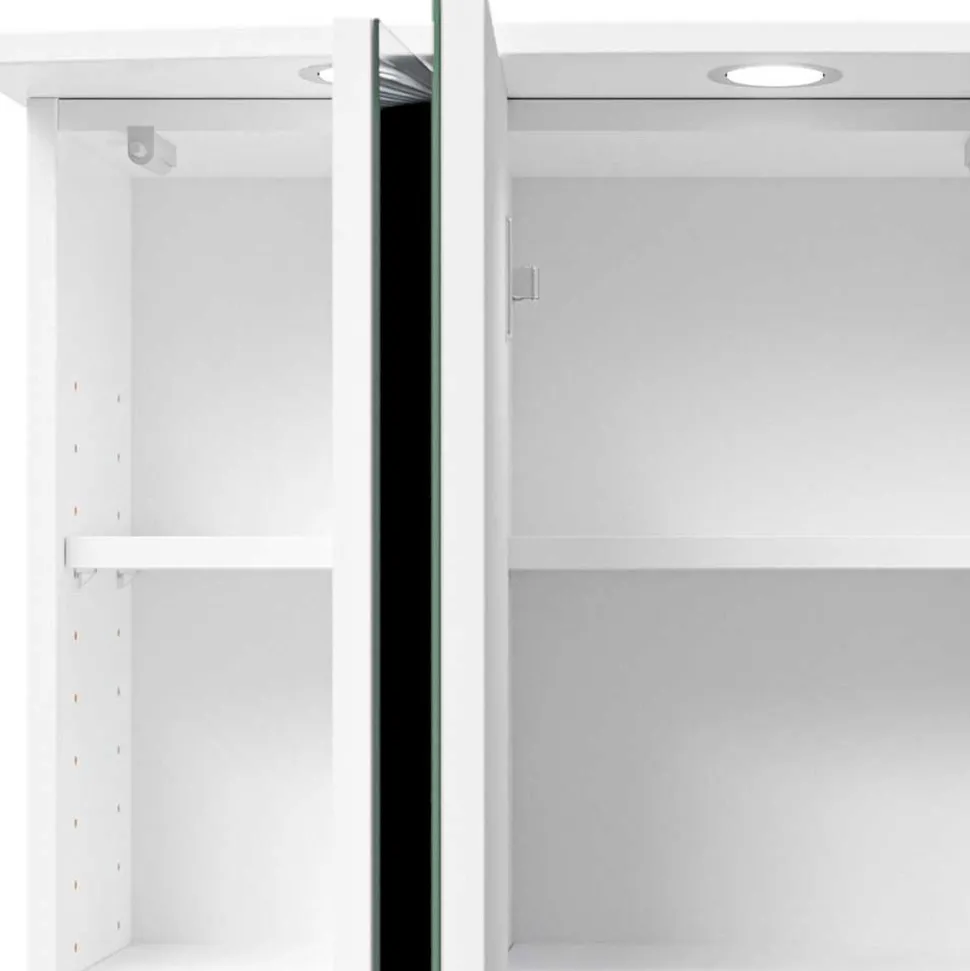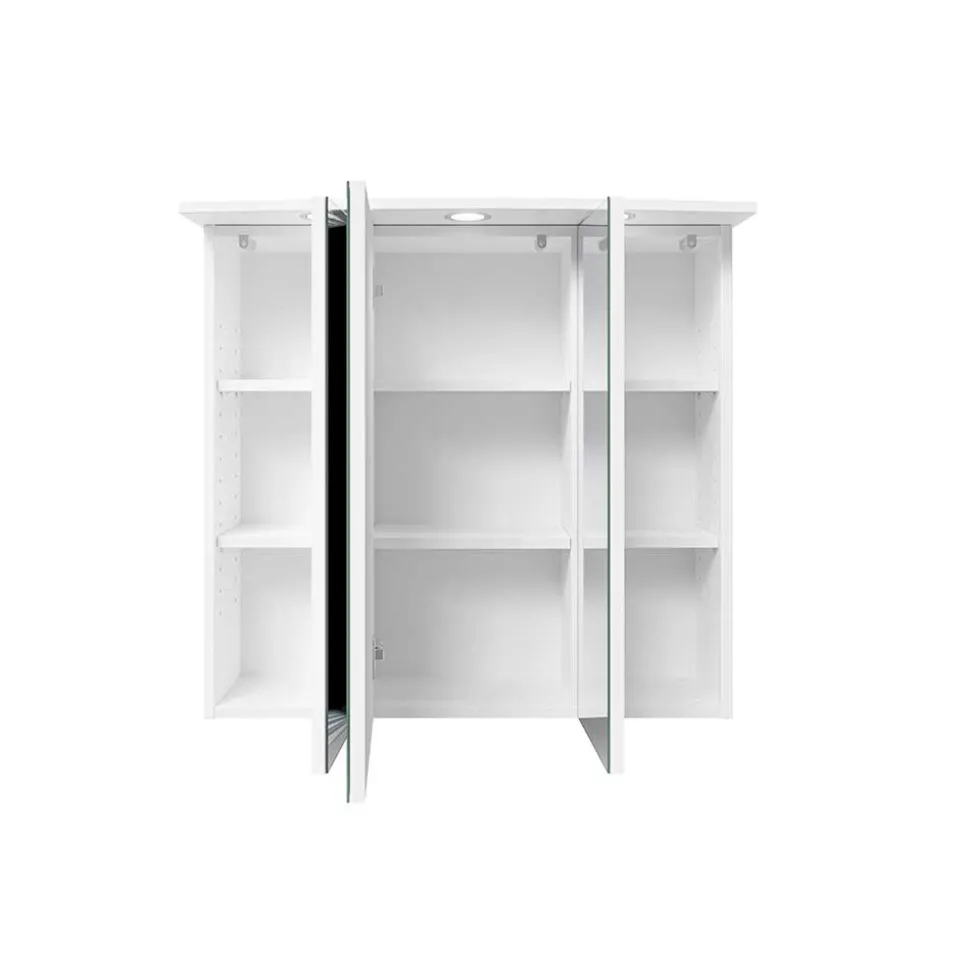 Das Set „Bahare“ bietet vielfältige und durchdachte Aufbewahrungsmöglichkeiten: Der Spiegelschrank verfügt über drei Türen, wobei die mittlere Tür etwas breiter ist. Hinter jeder Tür befinden sich zwei Einlegeböden, sodass insgesamt gleich neun Fächer reichlich Platz für Pflegeprodukte und Accessoires bieten. Ein integrierter LED-Streifen in der Deckplatte des Spiegels sorgt für eine angenehme Beleuchtung, und eine Steckdosen-Schalter-Kombination ermöglicht das bequeme Aufladen von Geräten wie Rasierer oder Zahnbürste. Zum Öffnen dienen dezente Stiftgriffe aus Metall, die am unteren Rand der Türen befestigt sind.