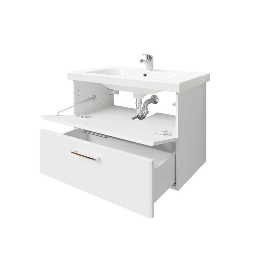 Die Waschtischkonsole dieses Sets ist ein wahres Raumwunder: Eine robuste Klappe mit Metallscharnieren verbirgt praktischen Stauraum, und darunter sorgt eine leichtgängige Schublade mit Metallauszug für zusätzlichen Platz. Das hochwertige Einlass-Waschbecken aus weißer Keramik fügt sich perfekt ein und bildet eine harmonische Einheit mit der Konsole. Dank dreidimensional justierbarer Wandbeschläge lässt sich die Konsole optimal an Ihre Bedürfnisse anpassen.
