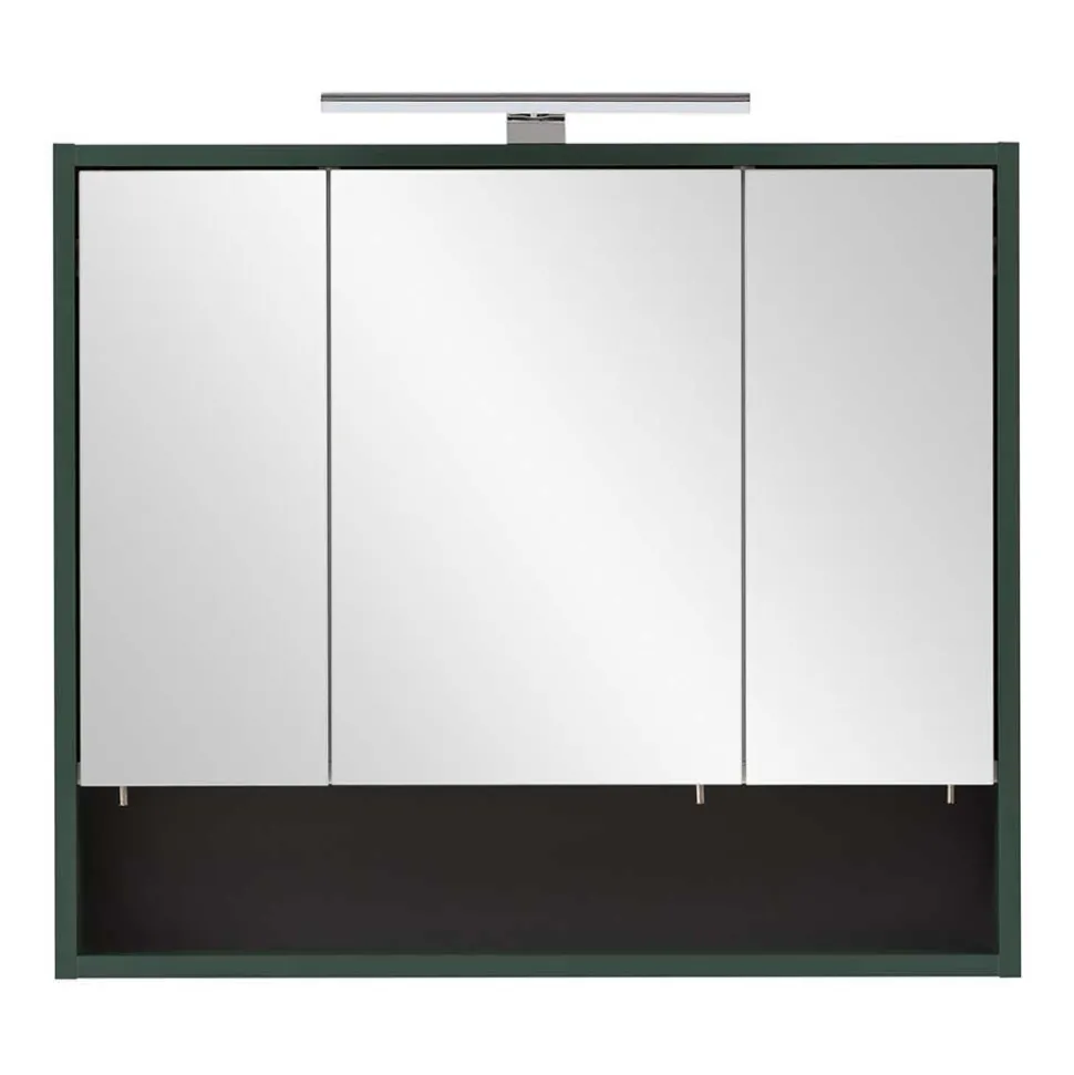 - Spiegelschrank (70x64x16 cm): Dieser Spiegelschrank ist mehr als nur ein Spiegel – er ist ein echtes Raumwunder! Mit drei Türen, die dank der Anschlagdämpfung sanft schließen, drei Glasböden für flexible Ablageflächen und einer innenliegenden Steckdose sind alle wichtigen Dinge sicher und praktisch verstaut. Das offene Fach bietet schnellen Zugriff auf die wichtigsten Pflegeprodukte. Die hochwertige LED-Aufsatzleuchte (Breite: 30,8 cm) sorgt für eine klare und angenehme Beleuchtung, die jeden Morgen perfekt starten lässt.