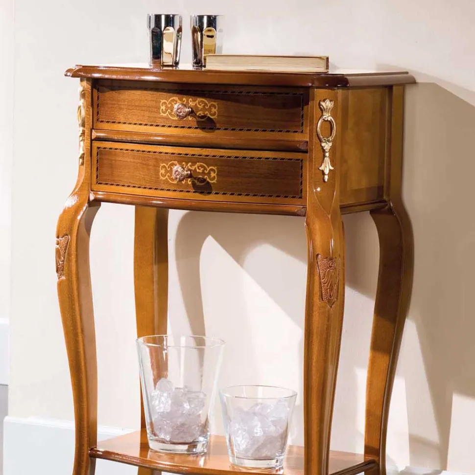 Die Oberflächen des Tisches sind mit echtem Nussbaumholzfurnier überzogen und komplett lackiert, was ihnen eine warme, ansprechende Optik verleiht. Die Fronten bestechen durch majestätisch florale Muster in Form von handgearbeiteten Intarsien, einem Zeugnis echter Handwerkskunst, das die einzigartige Schönheit dieses Möbelstücks unterstreicht.