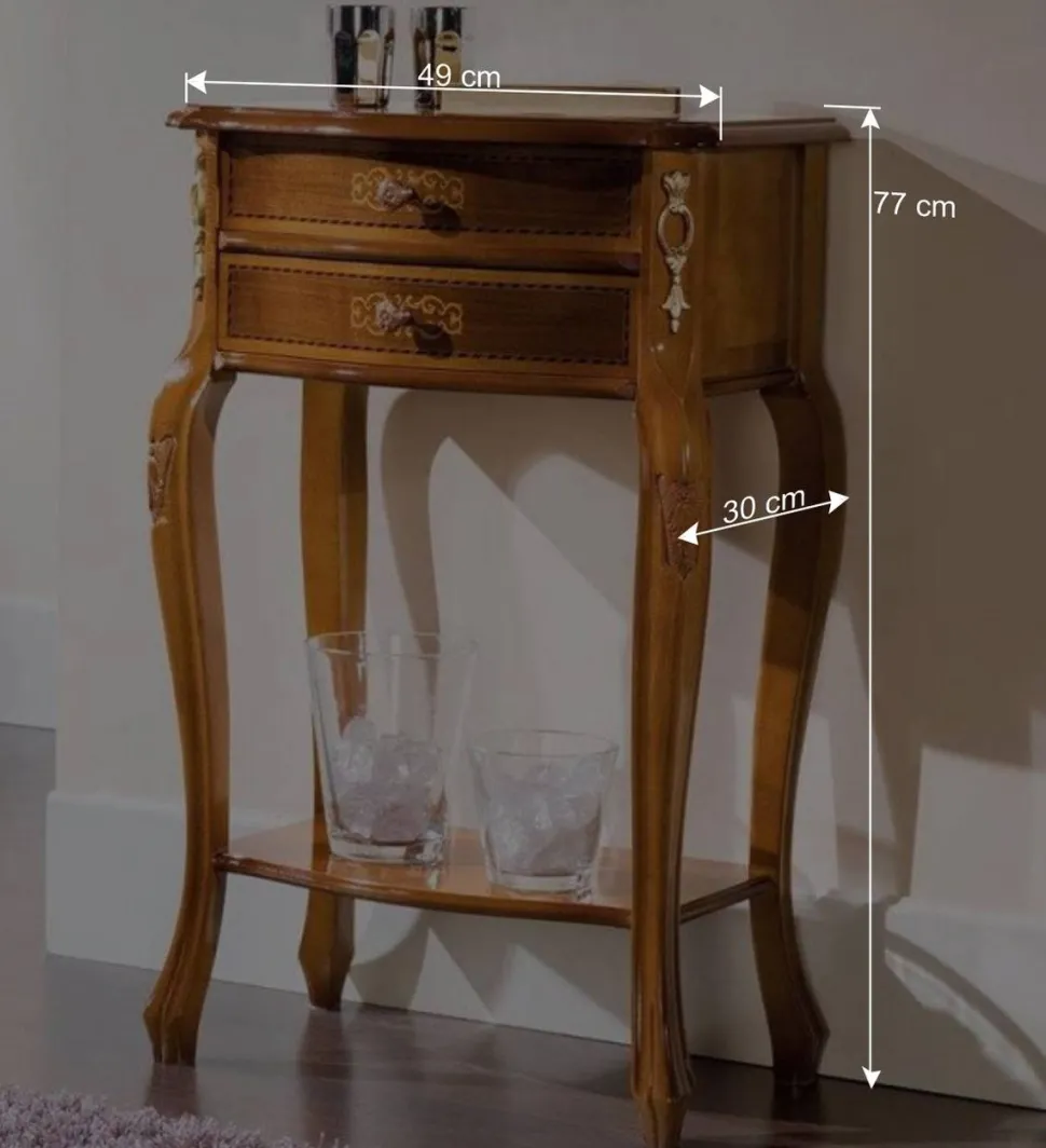 Mit seinen Maßen von 49 cm Breite, 77 cm Höhe und 30 cm Tiefe bietet der Beistelltisch „Natale“ nicht nur eine ästhetische Bereicherung für Ihr Zuhause, sondern auch praktischen Nutzen. Zwei geräumige Schubladen auf Holzauszügen und eine zusätzliche Ablagefläche bieten viel Stauraum. Die prächtigen Metallgriffe und die detailreichen Verzierungen an den Seiten der Kommode vollenden das Design.