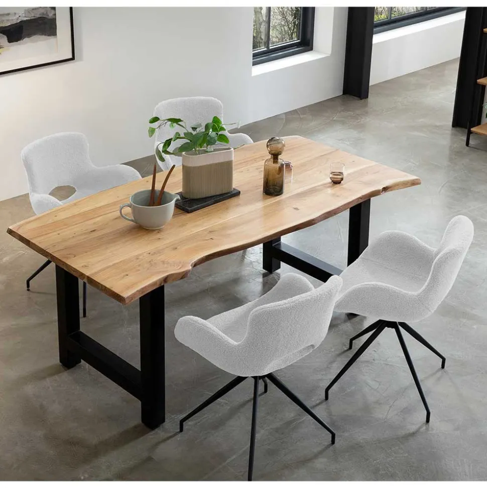 Für die Tischplatte kommt ausschließlich massives Akazienholz zum Einsatz – ein Material, das nicht nur durch seine markante Maserung überzeugt, sondern auch durch Widerstandsfähigkeit und Langlebigkeit. Eine spezielle Oberflächenbehandlung mit Öl und doppelter Wachsschicht schützt das Holz, betont die natürliche Struktur und sorgt für eine samtige Haptik. Diese sorgfältige Veredelung macht die Tischplatte nicht nur pflegeleicht, sondern auch besonders resistent gegenüber äußeren Einflüssen wie Feuchtigkeit oder Kratzern.
