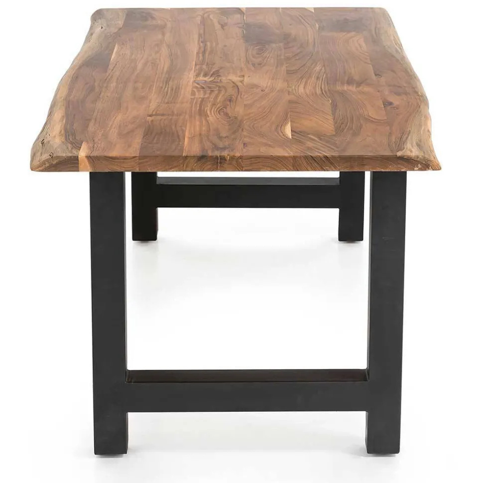 Die Tischplatte beeindruckt nicht nur durch ihre stattliche Stärke von ca. 3,5 cm, sondern vor allem durch die charakteristische Baumkante – eine unregelmäßige, naturbelassene Schnittkante, die aus dem gewachsenen Stamm stammt. Diese Kante verleiht dem Tisch seine Einzigartigkeit und sorgt für ein organisches Design, das jeden Raum aufwertet. Kein Tisch gleicht dem anderen – jedes Stück ein unverwechselbares Unikat.