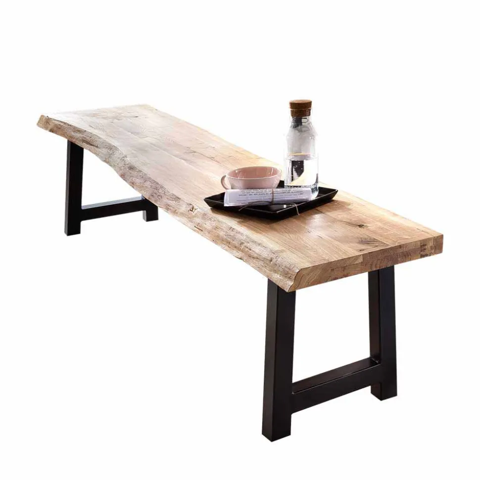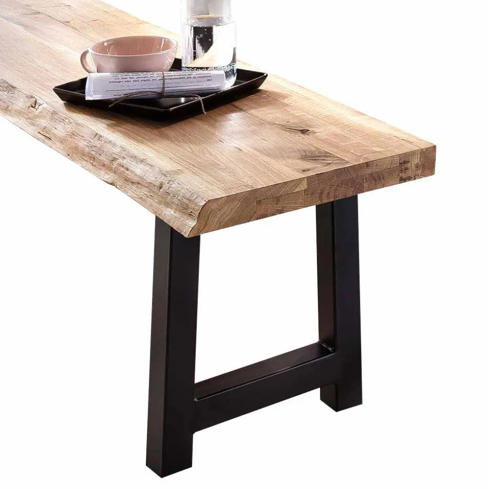Hergestellt aus hochwertigem massivem Eichenholz, bringt die „Morienta“ die Wärme und Langlebigkeit dieses edlen Materials direkt zu Ihnen nach Hause. Eiche ist für ihre Härte und Widerstandsfähigkeit bekannt und zeichnet sich durch eine schöne Maserung sowie natürliche Risse und Astlöcher aus. Diese Charakteristika unterstreichen die Einzigartigkeit jedes Möbelstücks und machen es zu einem Unikat. Ergänzt durch ein Vierfuß-Gestell in A-Form, gefertigt aus in Schwarz pulverbeschichtetem Metall, bietet die Bank nicht nur eine stabile Unterlage, sondern auch eine optische Verbindung zur Industriekultur.