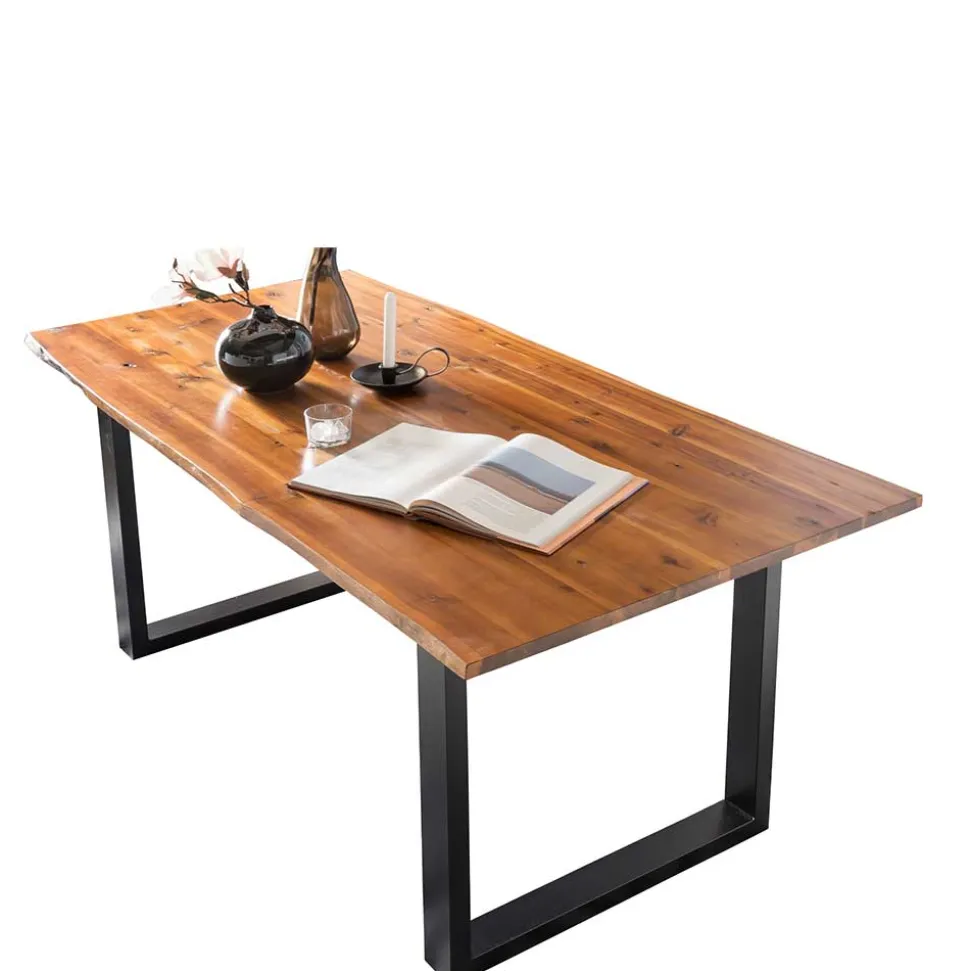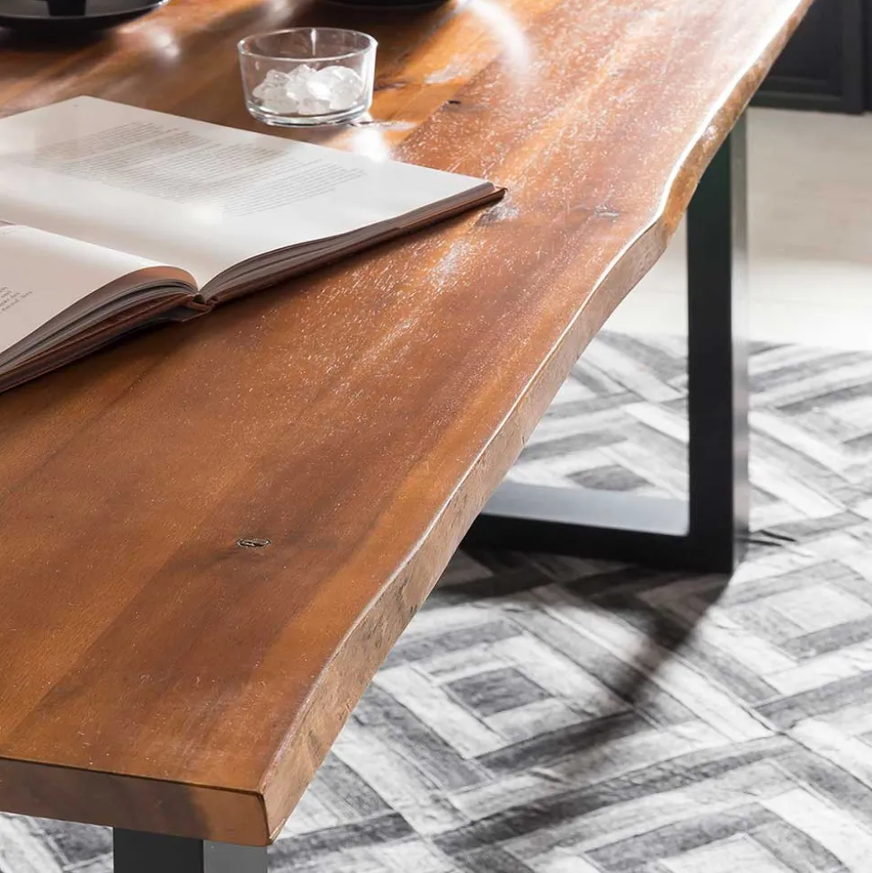 Mit einer Stärke von 2,6 cm zeigt sich die Tischplatte stabil, robust und dennoch filigran im Ausdruck. Die Oberfläche wurde bewusst so behandelt, dass die markante Maserung und die Farbe des Holzes im Cognacton ihre volle Wirkung entfalten. Perfekt ergänzt wird die massive Platte durch das formschöne, standfeste Metall-Bügelgestell in Schwarz. Dieses bietet nicht nur großzügige Beinfreiheit, sondern steht auch für zuverlässige Stabilität – ganz gleich, wie viele Gäste am Tisch Platz nehmen.