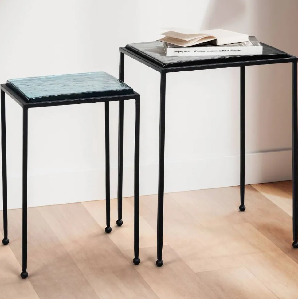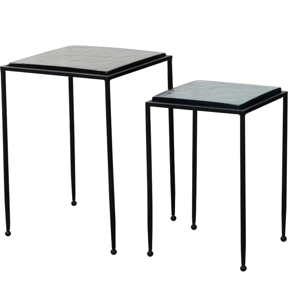 Die Tischplatten des Sets bestehen aus getöntem Strukturglas, das in einem schönen Blau eingefärbt wurde und mit einer Stärke von ca. 2,5 cm besonders robust ist. Die quadratischen Tischplatten sind unterschiedlich groß: Der große Tisch misst 35×35 cm und der kleine Tisch 28×28 cm. Das stabile Metallgestell in elegantem Schwarz ist pulverbeschichtet und sorgt für eine zeitlose Ästhetik. Mit vier Beinen, die sanft in kleine Kugelfüße übergehen, steht das Set sicher und verleiht Ihrem Raum einen modernen Touch.