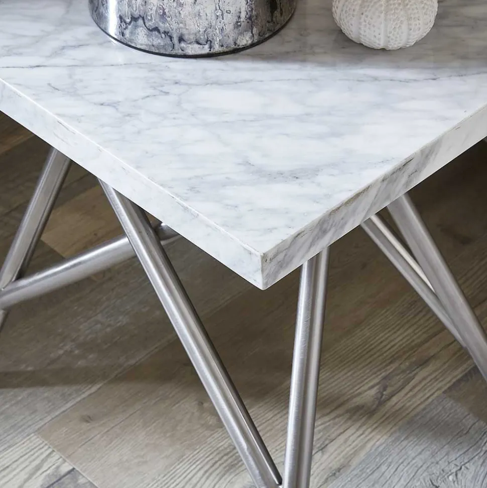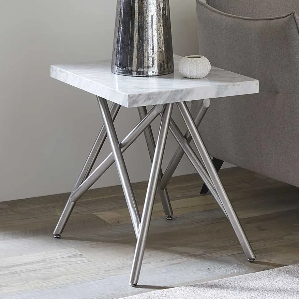 Das Design des Beistelltisches „Montao“ besticht durch seine klare Formensprache und die Kombination aus Marmor und Edelstahl. Das Vierfußgestell aus hochwertigen Edelstahlrohren ist nicht nur stabil, sondern auch ein echter Blickfang. Die gekreuzten Streben verleihen dem Tisch eine moderne Dynamik, die sich mühelos in jedes Interieur einfügt – ob im Wohnzimmer, im Schlafzimmer oder in Ihrem Büro.