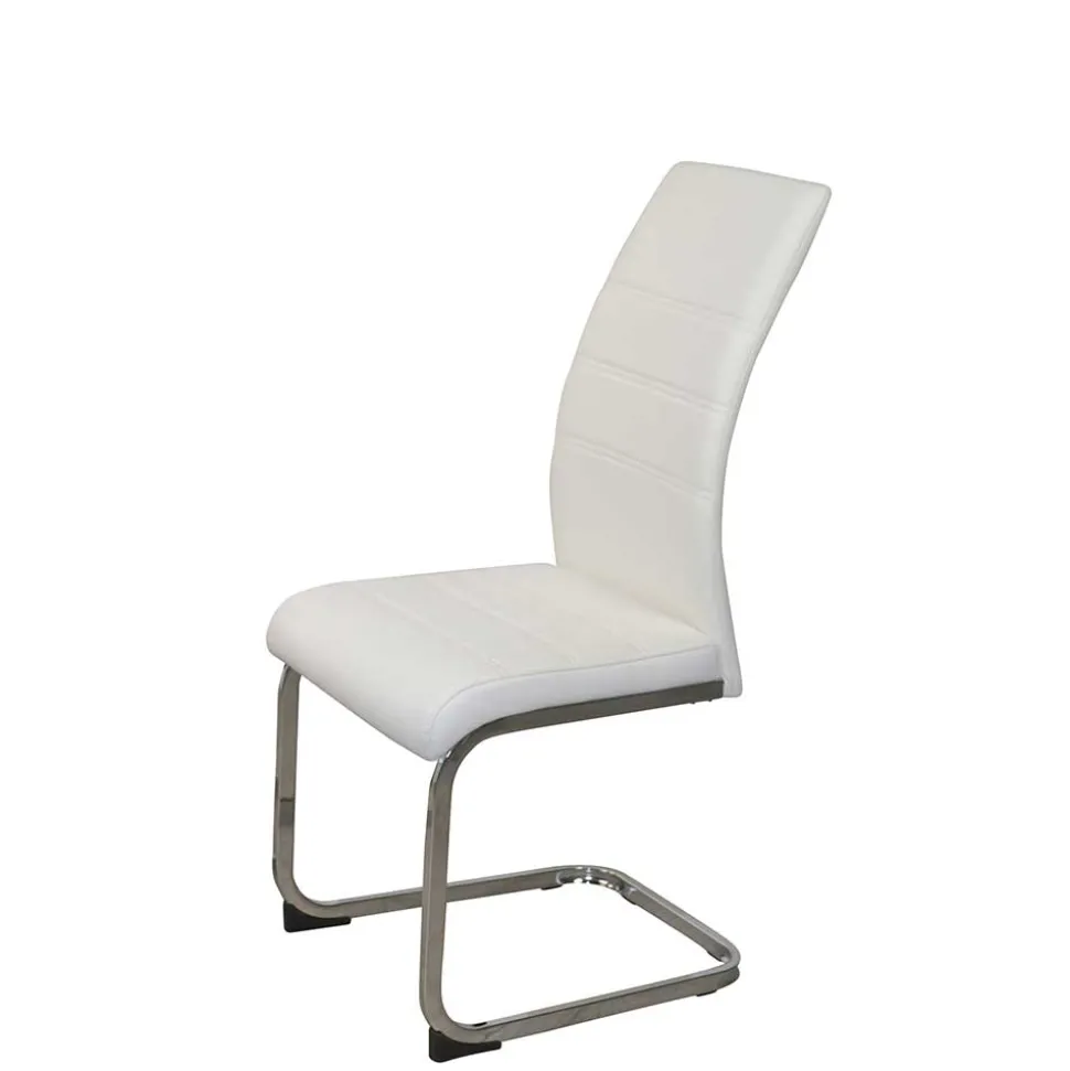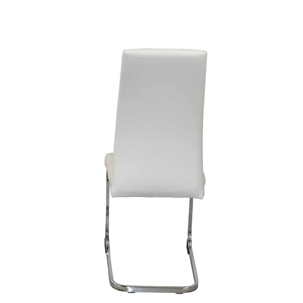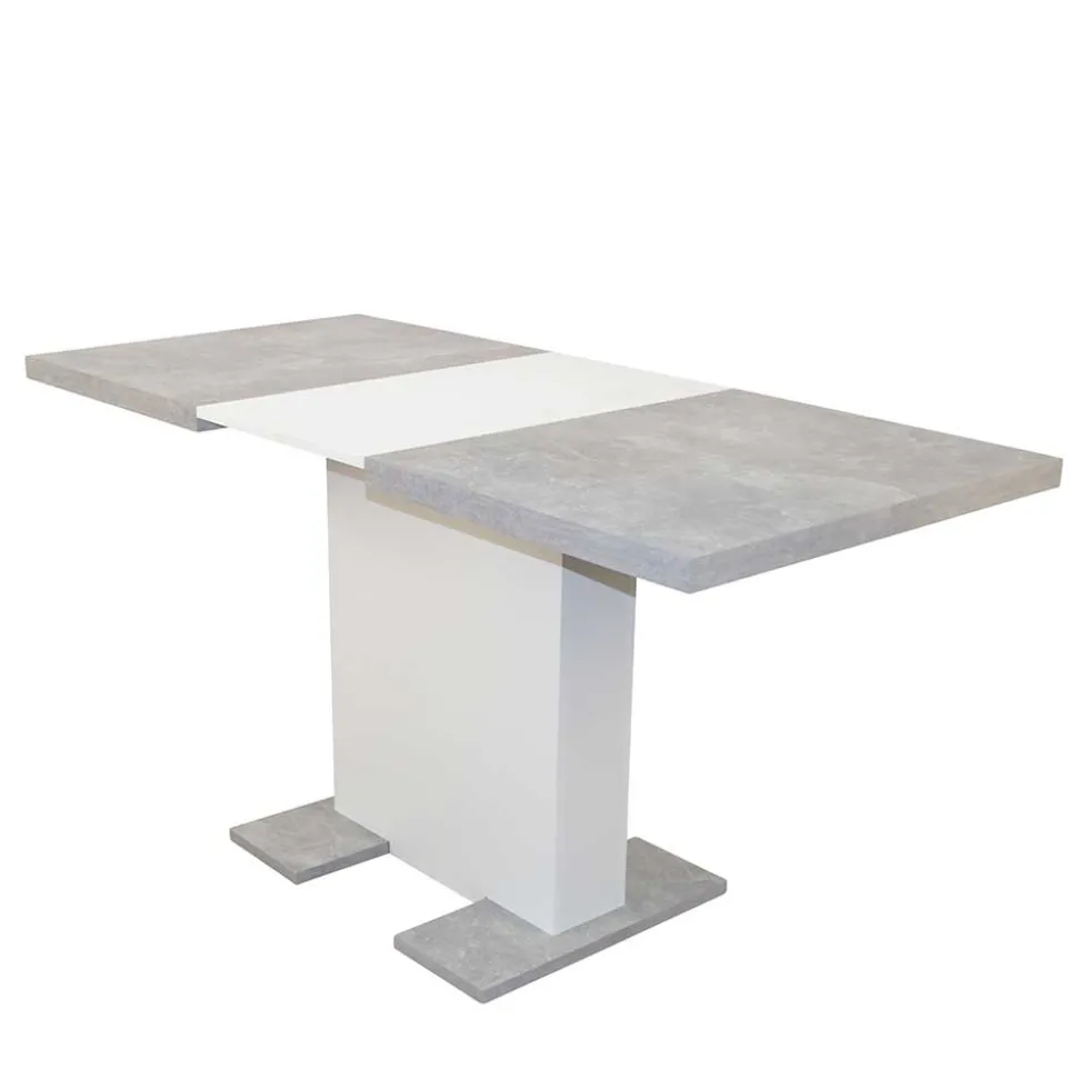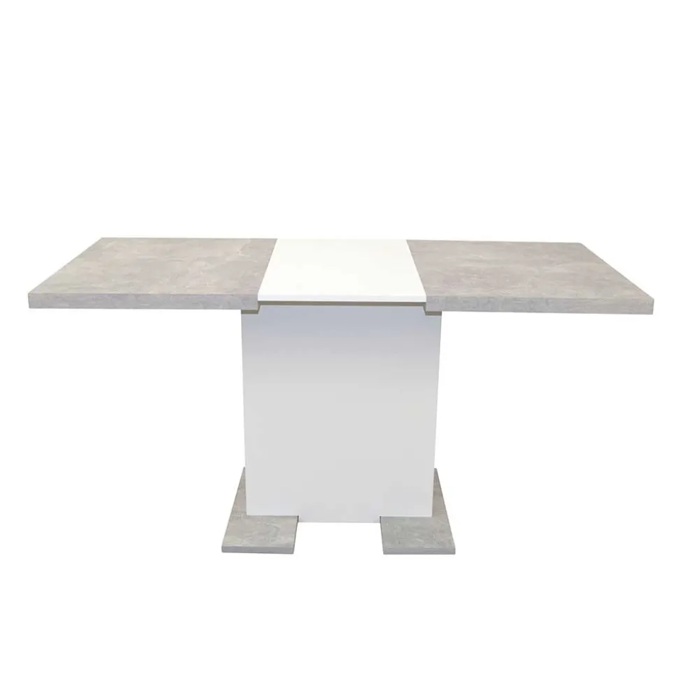 Modernität zeigt sich nicht nur in der Form, sondern auch im gekonnten Zusammenspiel der Materialien und Farben. Weiß, Chrom und eine authentisch wirkende Beton-Optik sorgen für eine kontrastreiche, urbane Ausstrahlung. Der Tisch mit seiner rechteckigen Form präsentiert sich in einer eleganten Mischung aus grauer Beton-Oberfläche und weiß melaminbeschichteten Flächen – ein spannendes Wechselspiel aus Struktur und Klarheit. Die Stühle greifen diesen Stil perfekt auf, mit weißem Kunstlederbezug und glänzend verchromten Metallgestellen. So entsteht ein harmonisches Gesamtbild, das sich nahtlos in moderne Wohnwelten einfügt und gleichzeitig markante Akzente setzt.