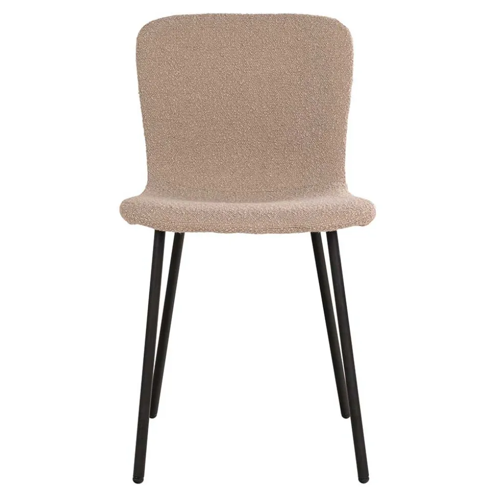 Der Stuhl „Menoria“ überzeugt durch seine ausgewählten Materialien: Der Bezug besteht aus 100% Polyester-Boucle, einem weichen, pflegeleichten und zugleich strapazierfähigen Stoff, der höchsten Sitzkomfort bietet. Die ergonomisch geformte Sitzschale mit einer komfortablen Rückenlehne und einer sanft abgerundeten Vorderkante lädt zum Verweilen ein. Das filigrane Gestell aus schwarzem Metall verleiht dem Stuhl nicht nur Stabilität, sondern auch eine moderne, schlanke Silhouette.