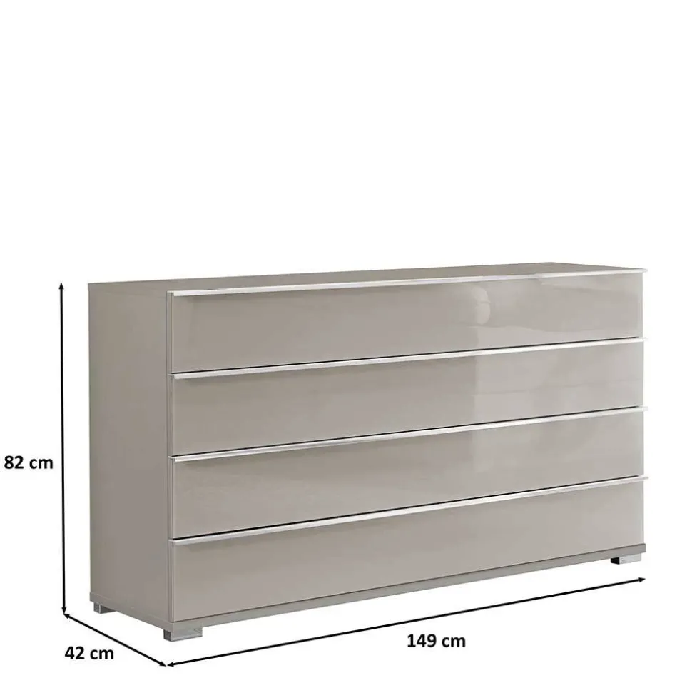 Bringen Sie mit der 149 cm breiten Kommode „Nucina“ einen Hauch von Eleganz und moderne Raffinesse in Ihr Zuhause. Die hellgrau beschichtete Glasfront, kombiniert mit dem hellgrau folierten Korpus, schafft eine harmonische und zeitlose Optik, die sich mühelos in jedes Interieur integriert.