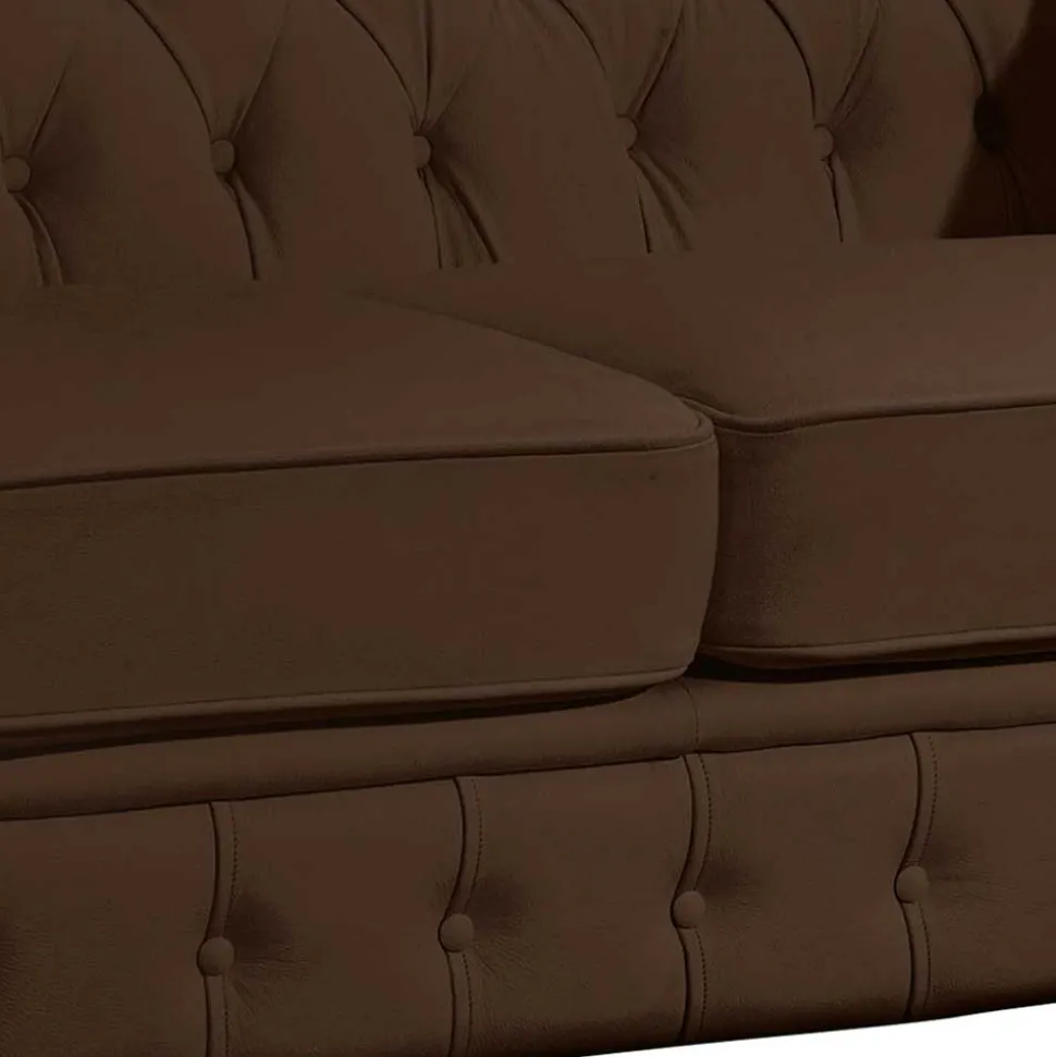 Das braune Leder des Sofas vereint sich harmonisch mit dem lackierten Massivholz in Nussbaum. Die extravagante Gestaltung im Chesterfield-Stil besticht durch die charakteristischen tiefen Steppungen und charmanten Knopfheftungen, die jedem Raum einen Hauch von Eleganz verleihen. Die herausragende Qualität des Sofas garantiert langanhaltende Freude und Wertbestand, dank widerstandsfähiger Oberflächen und einem stabilen Basisgestell aus Holzwerkstoff und Massivholz.