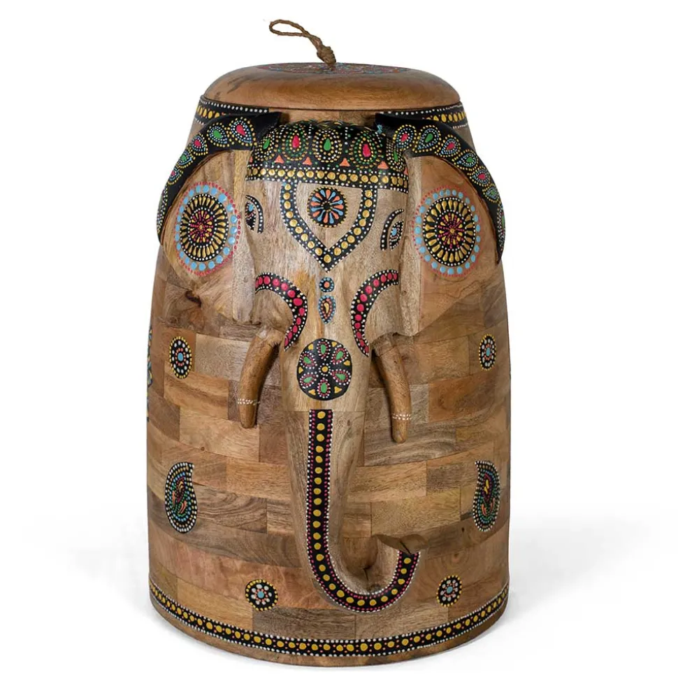 Der abnehmbare Deckel der Truhe ist mit einer praktischen Schlaufe versehen, die für zusätzlichen Komfort beim Öffnen sorgt. Im Inneren bietet die Truhe ausreichend Platz für Ihre Habseligkeiten und überzeugt nicht nur als dekoratives Element, sondern auch als praktische Aufbewahrungslösung. Die plastische Gestaltung des Elefanten sowie die kunstvollen, bunten Ornamente machen sie zu einem besonderen Möbelstück, das sowohl funktional als auch ästhetisch begeistert.