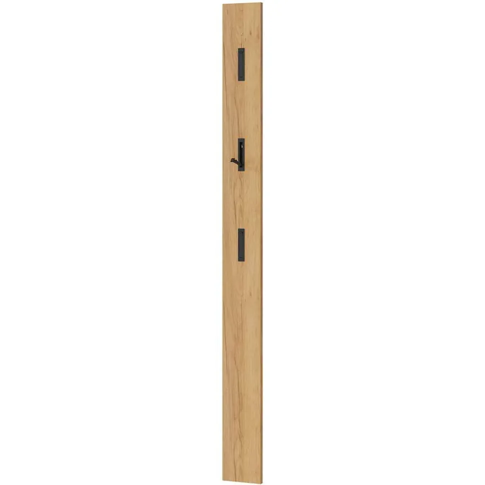 Das Garderobenpaneel in Wildeiche Natur bietet mit seinen drei einklappbaren Kleiderhaken aus schwarzem Metall zusätzlichen Stauraum für Jacken und Accessoires, während es mit einer Breite von nur 15 cm und einer Höhe von 169,8 cm auch in engen Fluren Platz findet. Die Lieferung erfolgt in demontierter Form, jedoch ermöglicht die beiliegende Anleitung einen unkomplizierten Aufbau.