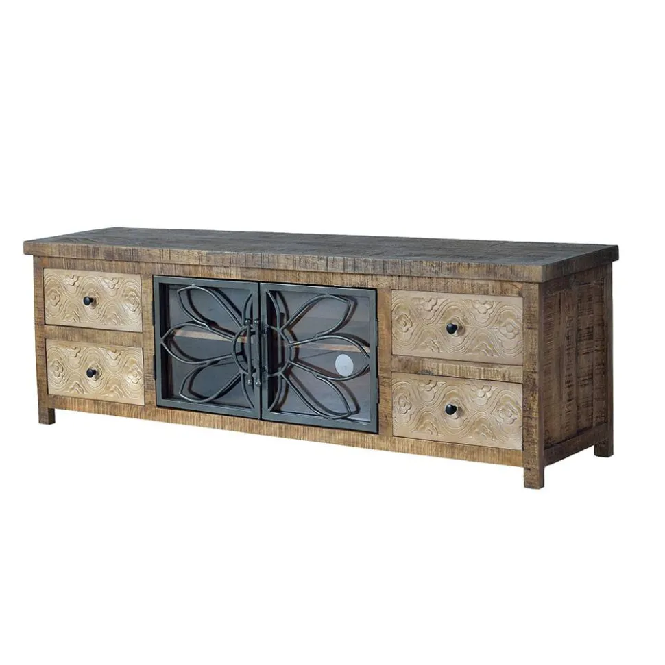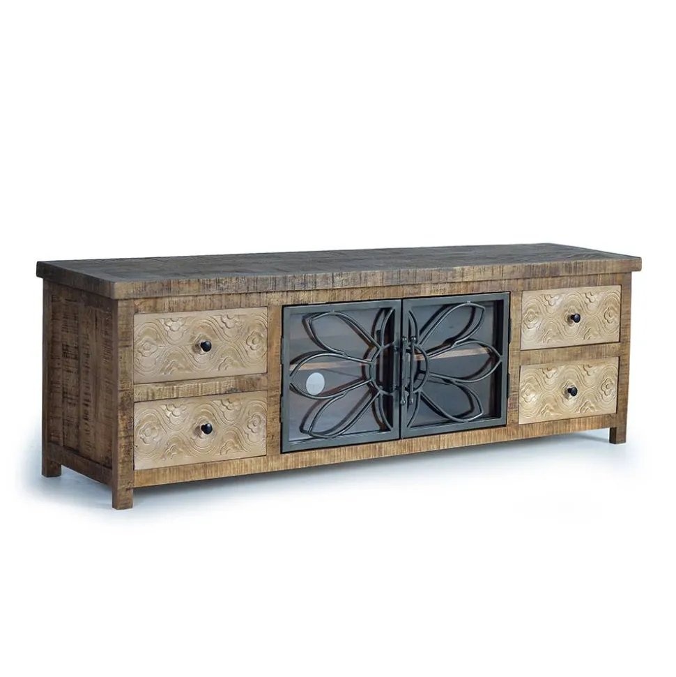 Das Lowboard beeindruckt nicht nur durch sein Design, sondern auch durch seine Funktionalität. Mit vier geräumigen Schubladen – je zwei auf der linken und rechten Seite – bietet es viel Platz für Ihre Utensilien. Die Schubladenfronten sind mit aufwendigen Schnitzereien verziert, die das Möbelstück zu einem echten Blickfang machen. In der Mitte befinden sich zwei Glastüren mit Metallrahmen und dekorativen Ornamenten. Dahinter verbirgt sich ein Einlegeboden, der zusätzlichen Stauraum für Bücher, Geschirr oder Dekorationsobjekte schafft. Die Kombination aus Stangengriffen an den Türen und Knopfgriffen an den Schubladen macht die Handhabung besonders komfortabel.