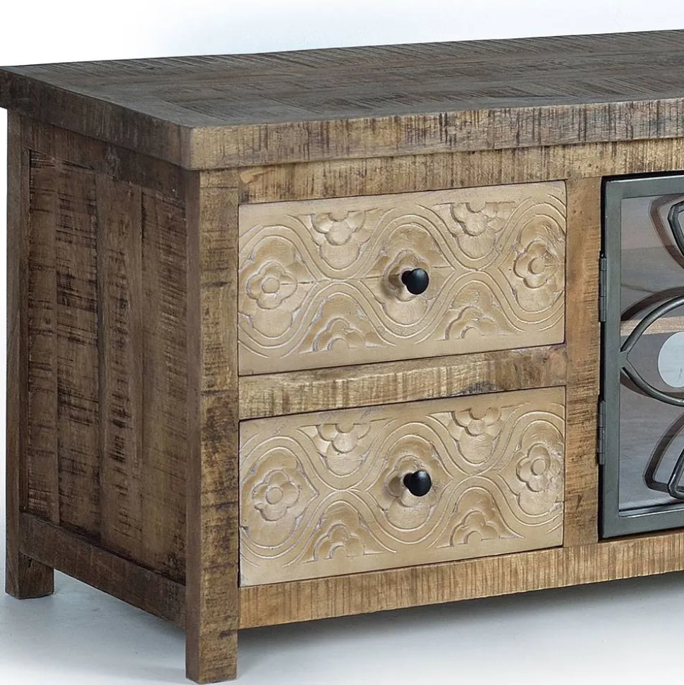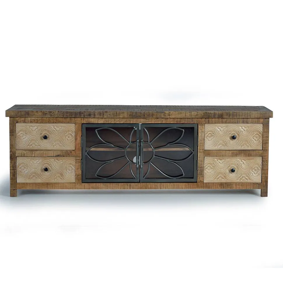 Das Design Lowboard „Everton“ wird aus massivem Mangoholz gefertigt, das für seine Robustheit und besondere Maserung bekannt ist. Die natürliche Oberflächenstruktur des Holzes, ergänzt durch realistische Gebrauchsspuren, sorgt für eine lebendige Optik. Metallrahmen und -griffe sowie dekorative Glaselemente setzen elegante Kontraste und runden das Design perfekt ab. Dank der hochwertigen Materialien bietet dieses Möbelstück nicht nur eine ansprechende Optik, sondern auch eine lange Lebensdauer.