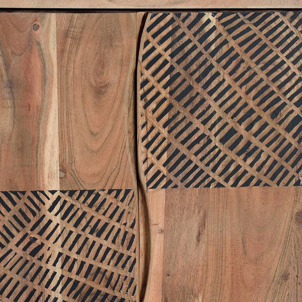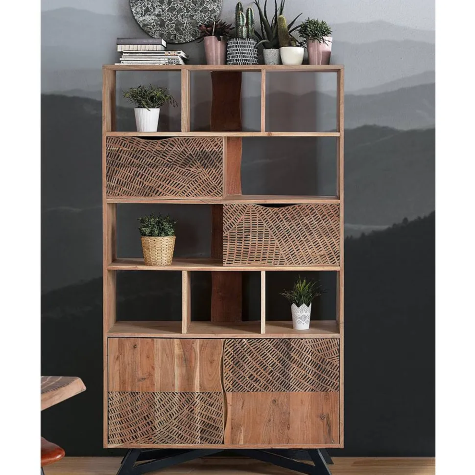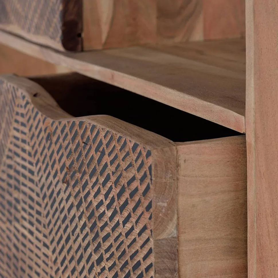 Gefertigt aus hochwertigem Massivholz der Akazie, besticht das Regal mit einer einzigartigen Maserung und natürlicher Robustheit. Die kunstvoll geschnitzten Fronten verleihen ihm einen besonderen Charme, während das in Handarbeit gefertigte Design jedes Stück zu einem Unikat macht. Die Unterschiede in Farbe, Struktur und Holzzeichnung unterstreichen den individuellen Charakter und machen „Merlan“ zu einem Möbelstück mit Persönlichkeit.