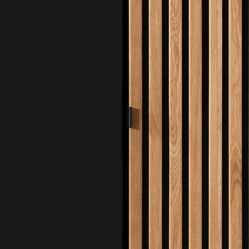 Die Möbel verzaubern nicht nur durch ihr natürliches Aussehen. Dekorative Fronten mit aufgesetzten Leisten geben dem Möbelset einen zusätzlichen Touch von Eleganz. Dabei sind die Rückwände hinter den Leisten kontrastreich in Schwarz abgesetzt. Ein besonderer Blickfang ist die mittige Türfront des Kleiderschranks, welche durch eine Glasbeschichtung in Anthrazit besticht.